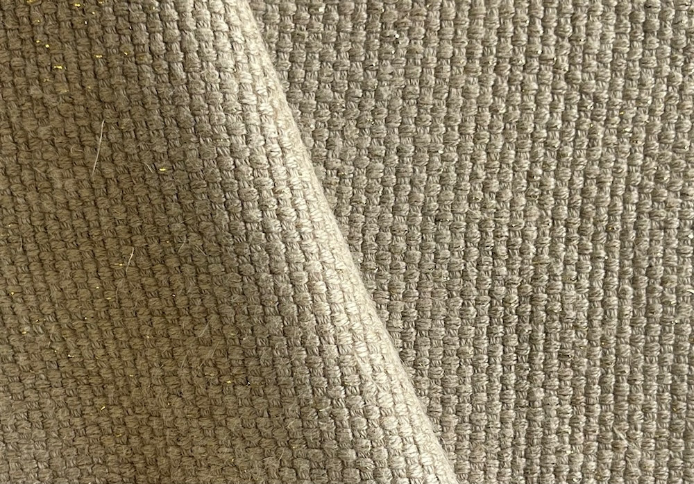 A linen in a classic shade of flax adorned with subtle metallic gold threads - with a chunky basketweave texture, this is perfect for upholstery, chairs, pillows, headboards, drapes, or garments. Made in Italy. 99% linen and 1% polyester. 53" wide.
