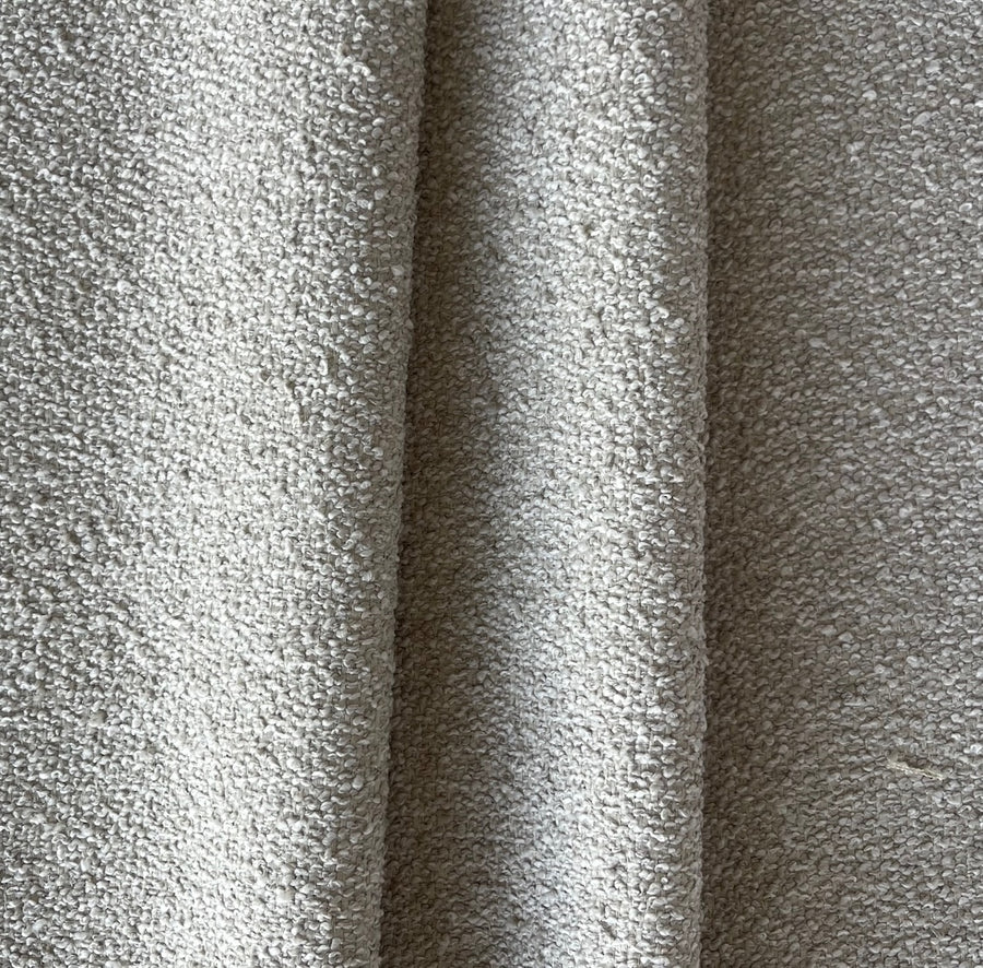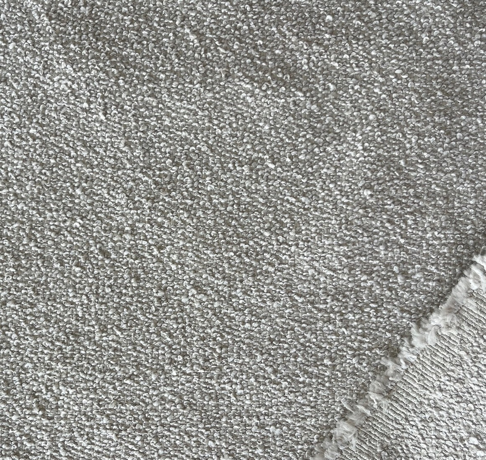 A basic home decorating polyester bouclé in a lovely neutral shade of oyster shell - this subdued, sophisticated textured bouclé is perfect for drapes, chairs, ottomans, and headboards. Made in Turkey. 100% polyester. 56" wide.