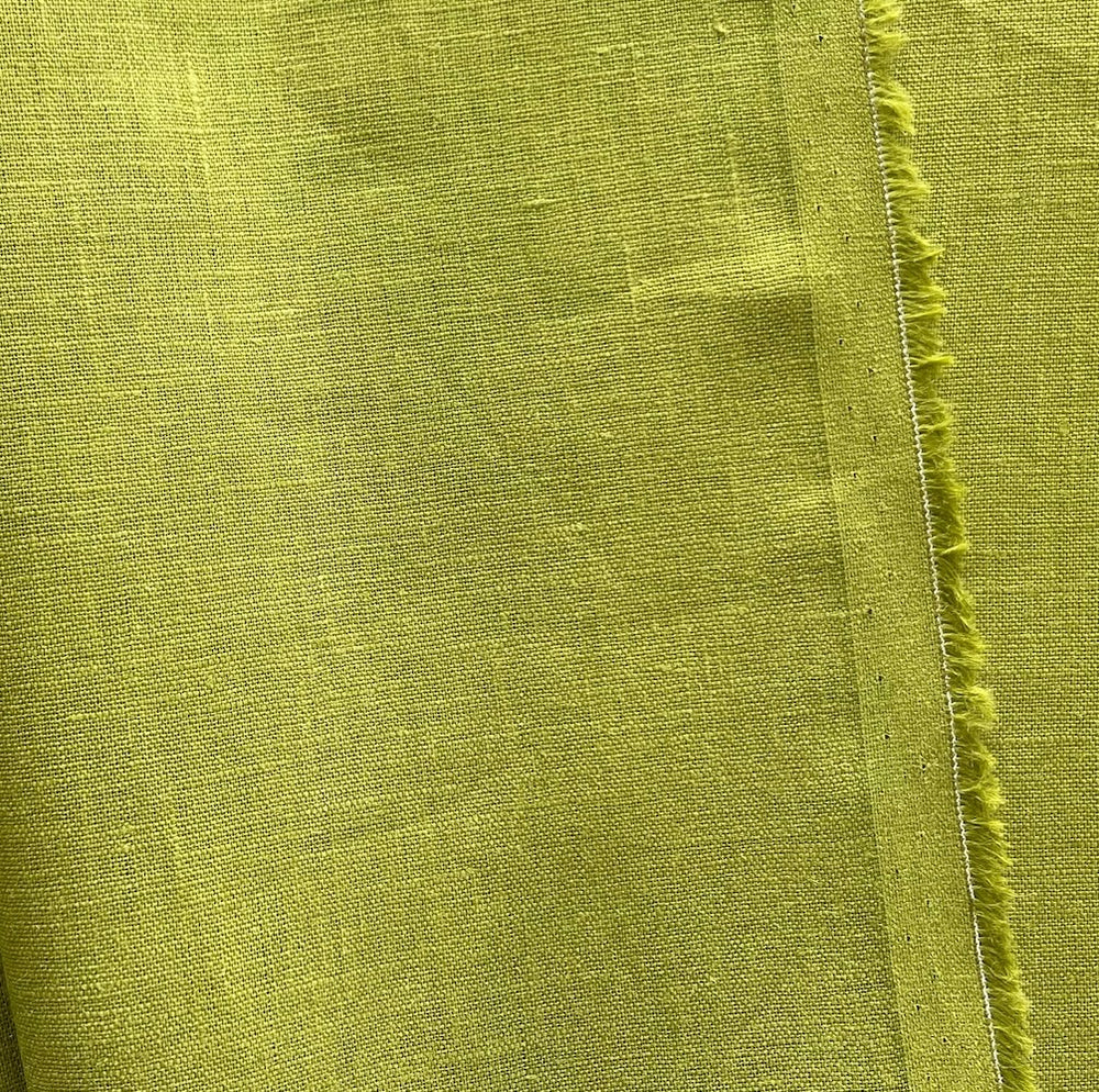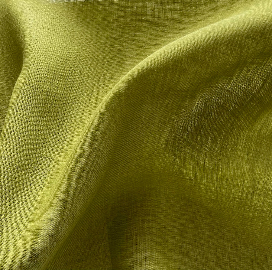 A semi-sheer, lighter-weight linen in Anjou Pear green - this airy, classic linen is perfect for blouses, dresses, curtains, or drawstring pants. Made in Italy and used by Bottega Veneta. 100% linen. 57" wide.
