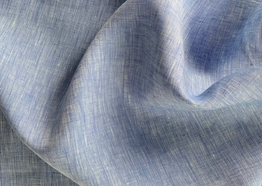A light to midweight linen in sky blue shot with white - perfect for a tailored shirt, elegant table linens, or lightweight trousers. Made in Turkey. 100% linen. 56" wide.