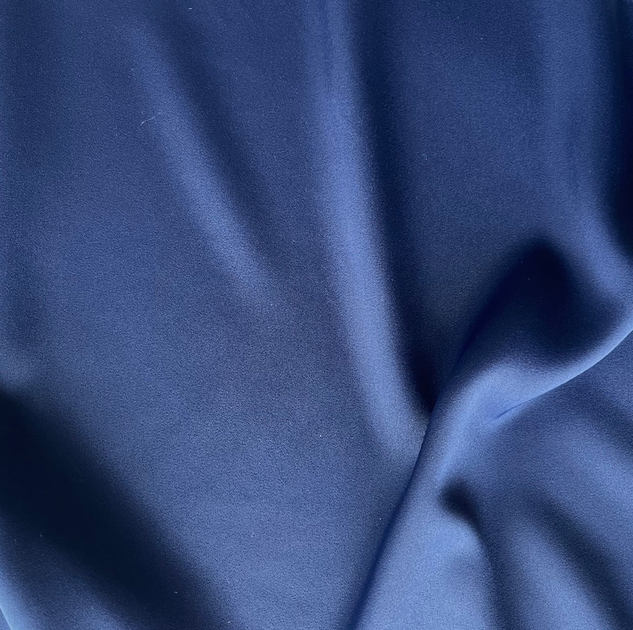 A mid-weight, stretch polyester duchess satin in admiral blue - with a hint of lycra, this washable, soft satin is perfect for travel-wear, blouses, or dresses. Made in Korea. Polyester and lycra. 60" wide.