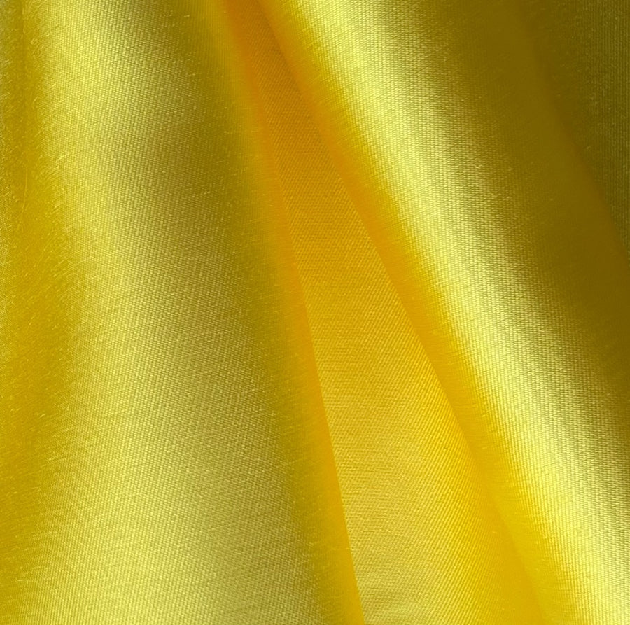 A stiffer, crisp polyester mikado twill in Cadmium yellow - a replica of silk mikado but in polyester, with a slight sheen on one side and matte on the reverse, this washable, shapely fabric is wonderful for fitted corsets, structured ball gowns, tablecloths, or full skirts. 100% polyester. 58" wide.