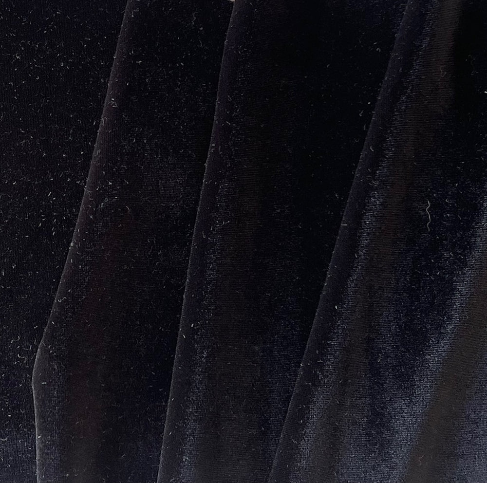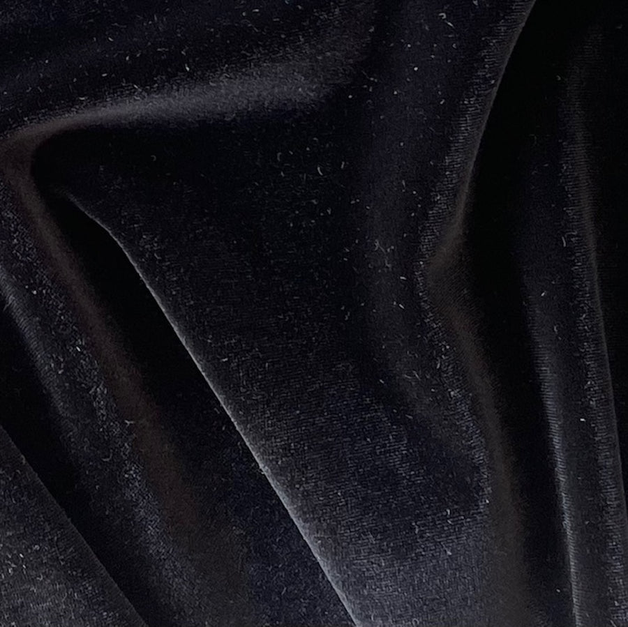A heavier weight drapey polyester velvet in classic coal black - with a touch of lycra, this washable velvet is perfect for tops, a long skirt, a surplice neckline dress, or a wrap. 420 Gm. 100% polyester. 60" wide.