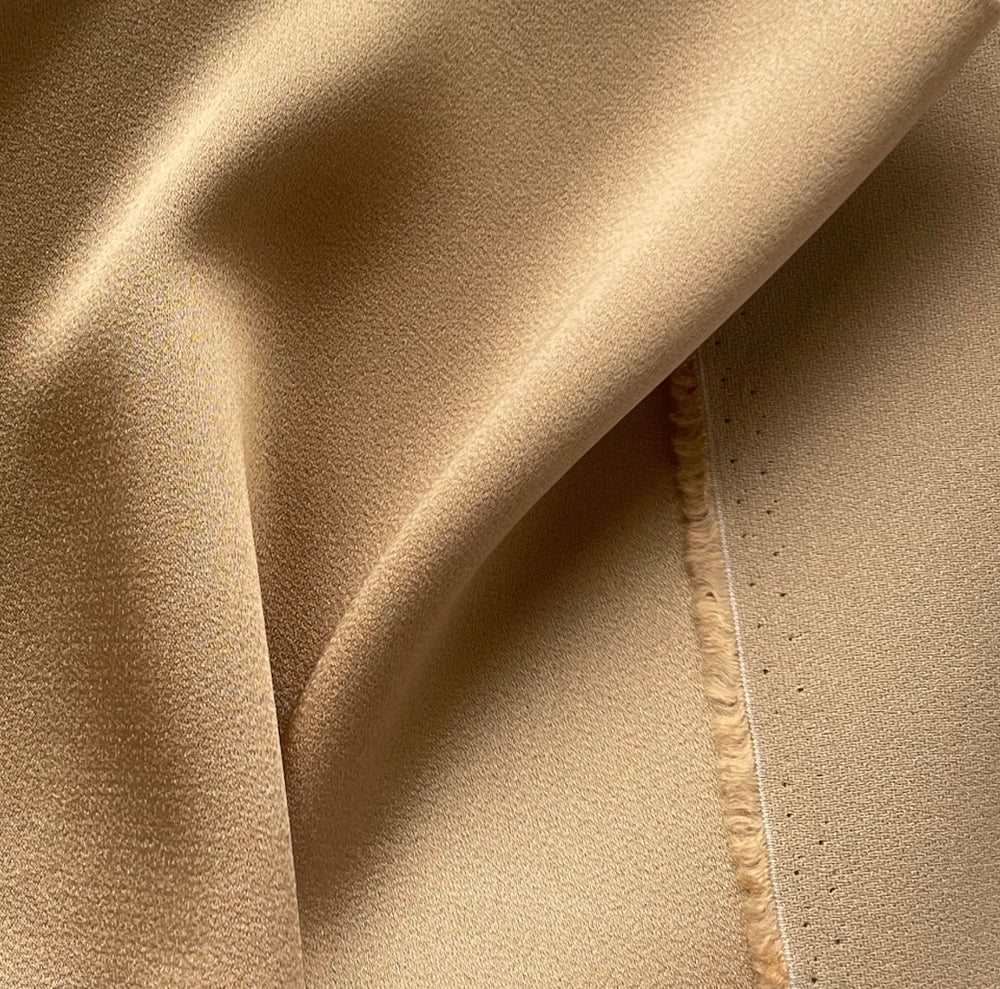 A designer mid-weight, double-sided rayon viscose blend crepe-back satin in Deep Champagne Gold - with the front side satin and the reverse matte, this gorgeous, drapey satin is low-wrinkle and perfect for travel-wear, a top, a dress, or full pants. Made in Italy. 50% rayon viscose and 50% acetate. 54" wide.