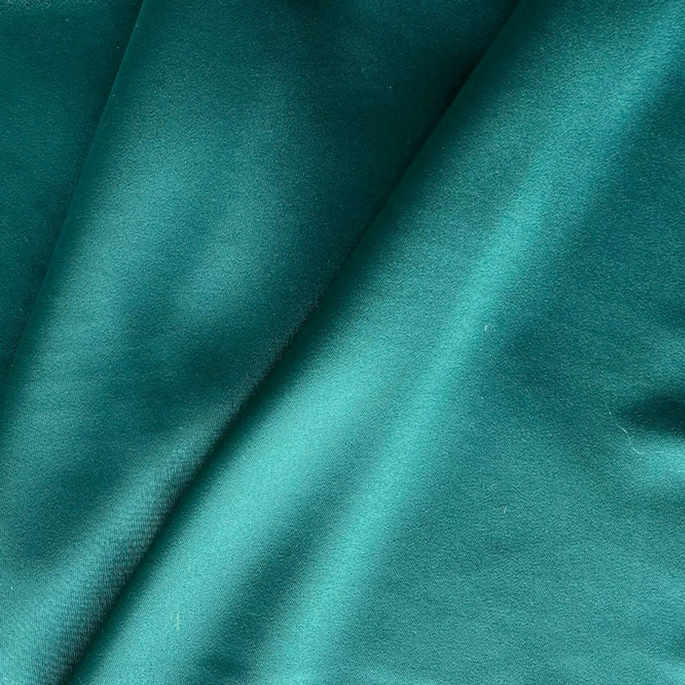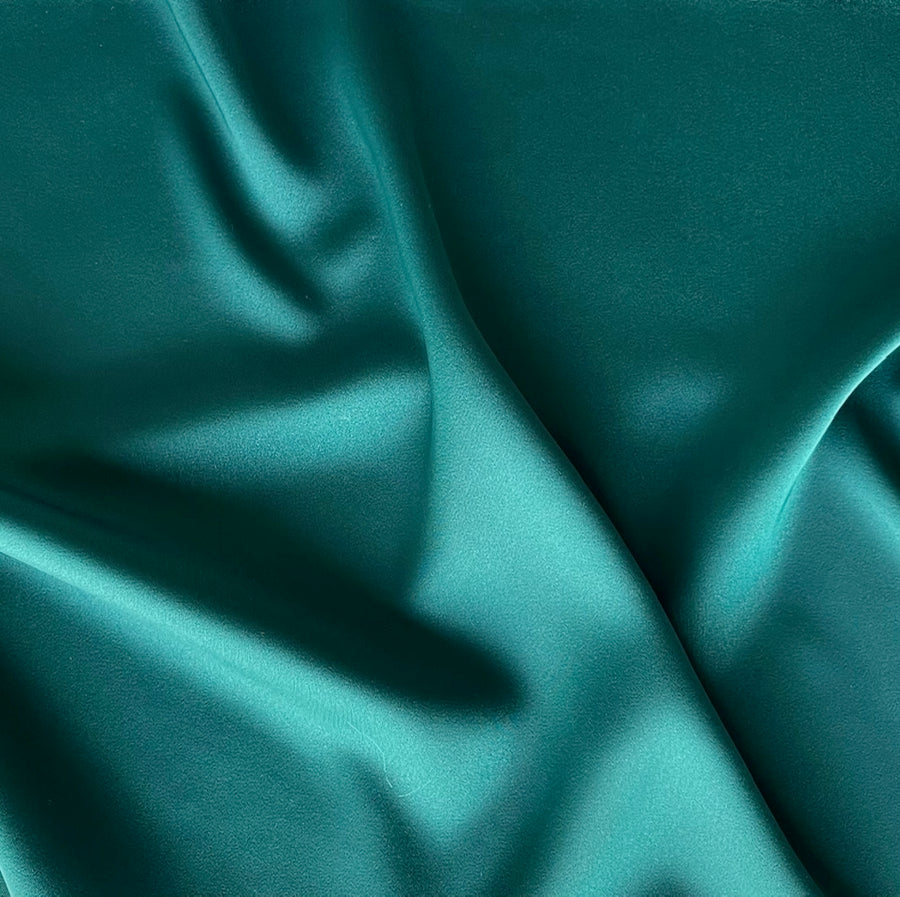 A mid-weight, stretch polyester duchess satin in Egyptian teal green - with a hint of lycra, this washable, soft satin is perfect for travel-wear, blouses, or dresses. Made in Korea. Polyester and lycra. 60" wide.