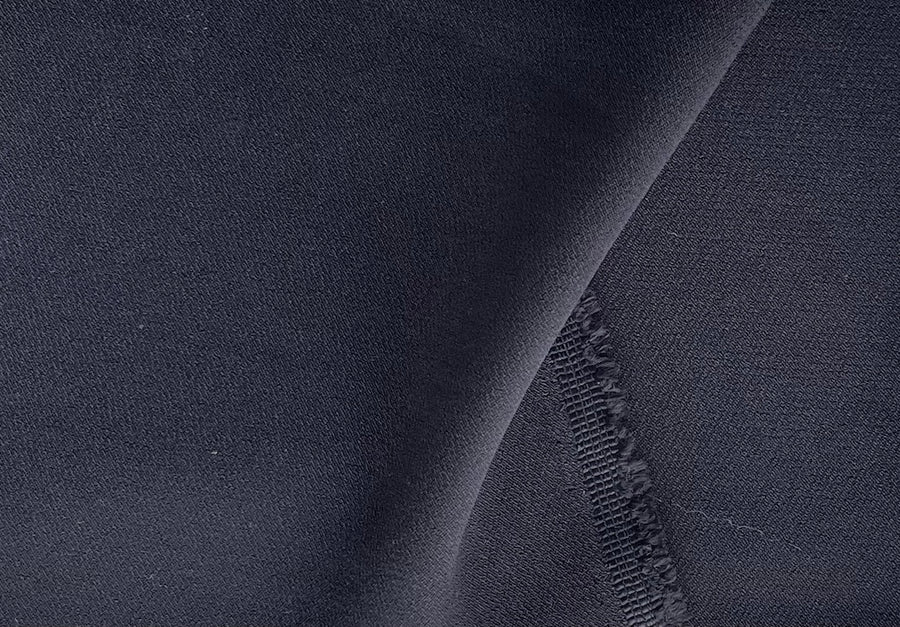 A stretch viscose blend in beauteous jet black - with a body and drape similar to 4-ply, this viscose is perfect for a blouse, slim cigarette pants, or a sheath dress. Made in Italy. Viscose, acetate, and lycra blend. 42" wide.