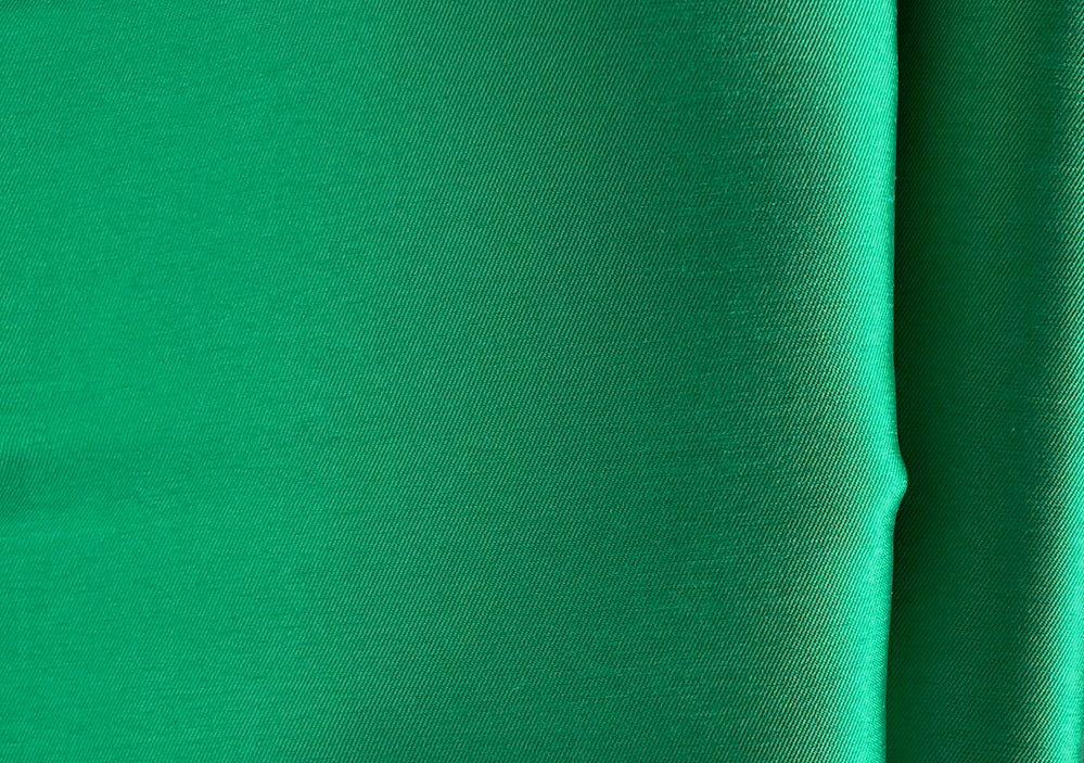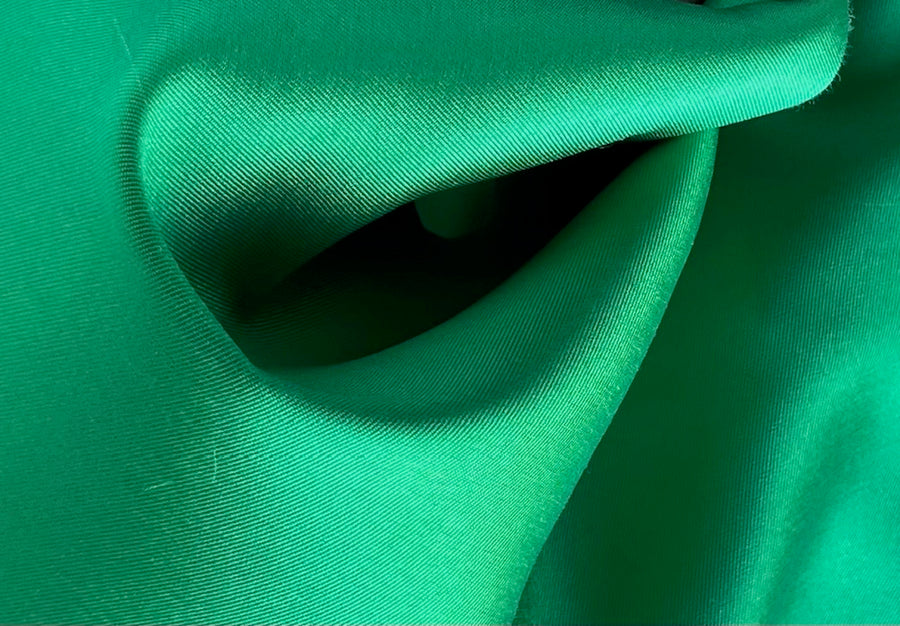 A crisp polyester mikado twill in lush emerald city green - similar to a stiffer organza and opaque, this shapely fabric is similar in weight to silk dupioni and wonderful for fitted corsets, structured ball gowns, tablecloths, or full skirts. 100% polyester. 58" wide.
