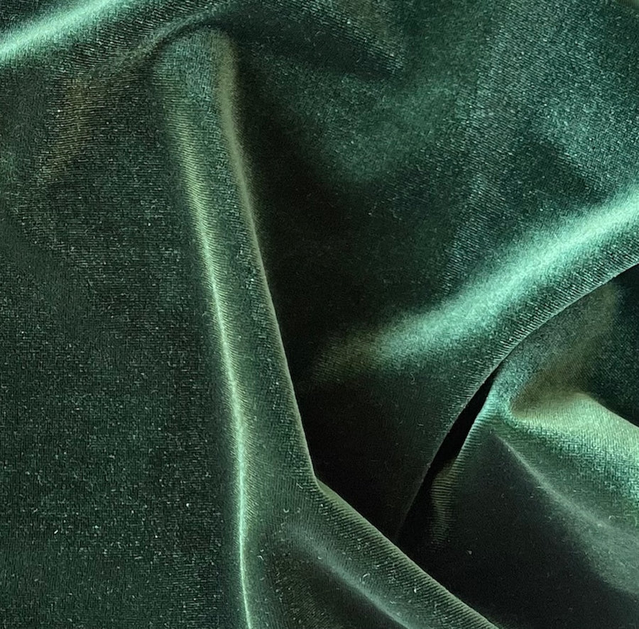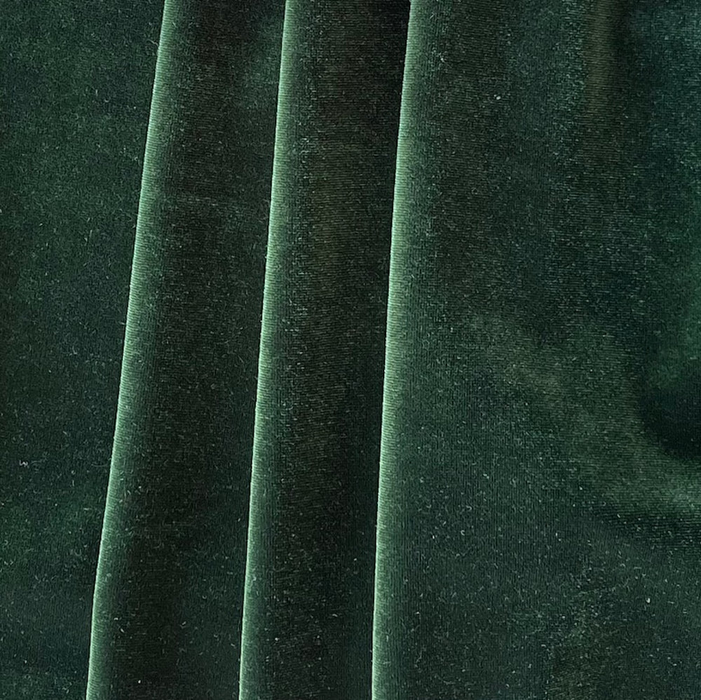 A drapey polyester velvet in festive Christmas green - with a touch of lycra, this washable velvet is perfect for tops, a long skirt, a surplice neckline dress, or a wrap. 420 Gm. 100% polyester. 60" wide.
