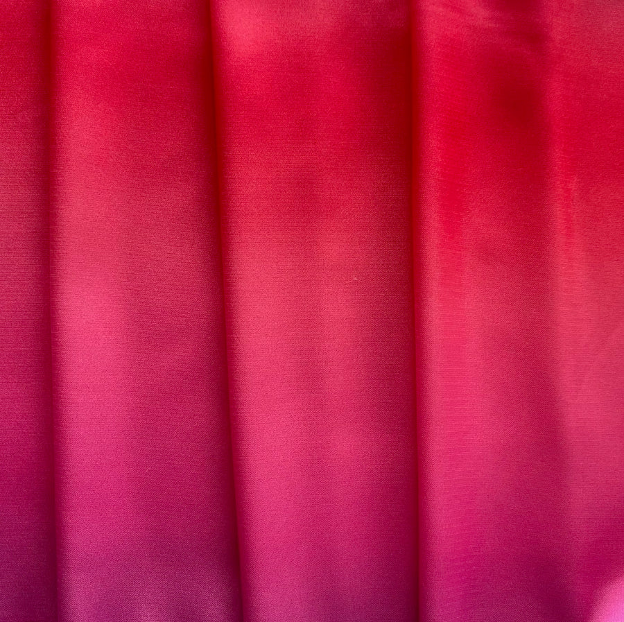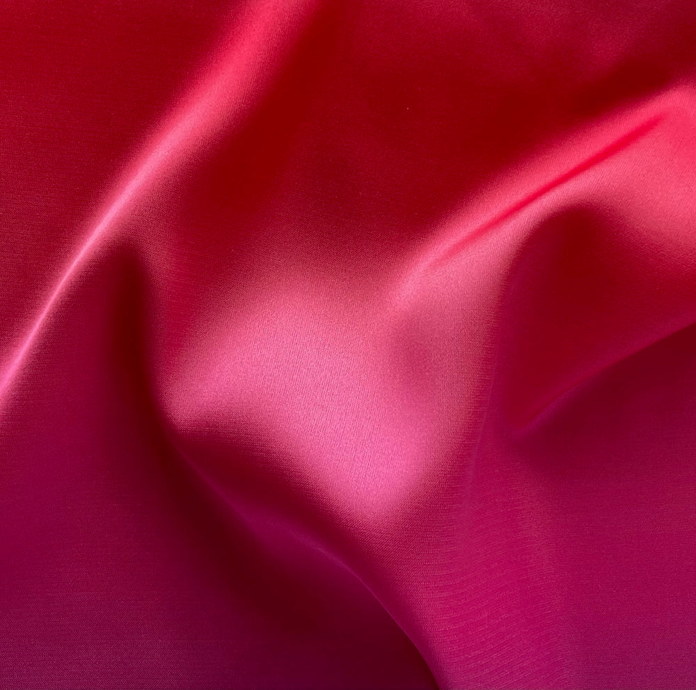 A stretch polyester satin charmeuse in a luscious ombré that glides from flamingo to fuchsia and raspberry- with a hint of lycra for comfort, this fluid satin is perfect for a bias cut dress, shirts, caftans, or lounge-wear. 96% polyester and 3% lycra. 56" wide.