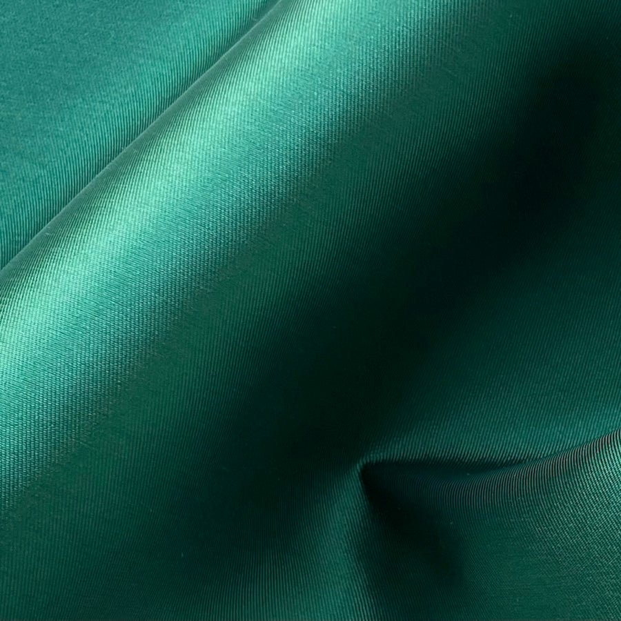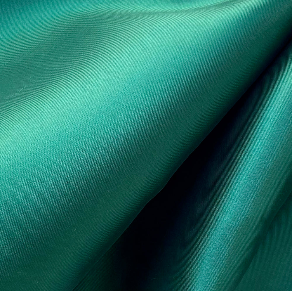 A stiffer, crisp polyester mikado twill in jade green - a replica of silk mikado but in polyester, with a slight sheen on one side and matte on the reverse, this washable, shapely fabric is wonderful for fitted corsets, structured ball gowns, tablecloths, or full skirts. 100% polyester. 58" wide.