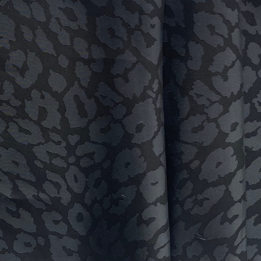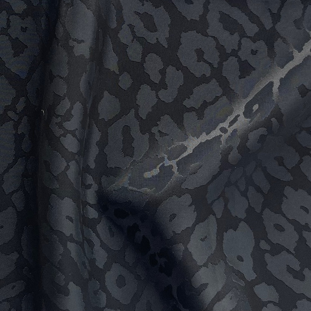 A gorgeous mid-weight rayon viscose blend satin jacquard with a tone-on-tone leopard spots pattern and in onyx - this drapey jacquard is perfect for a top, a dress, or full pants. Made in Korea. 50% rayon viscose and 50% acetate. 59" wide.