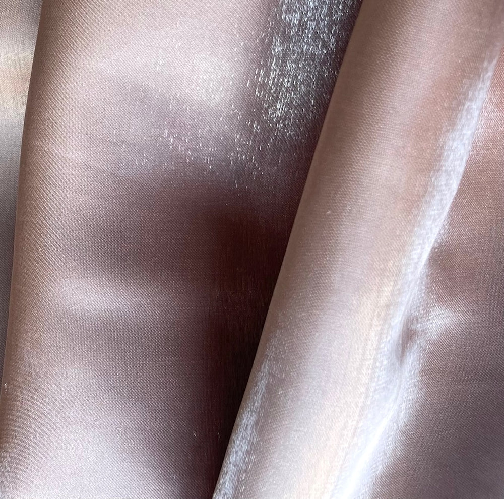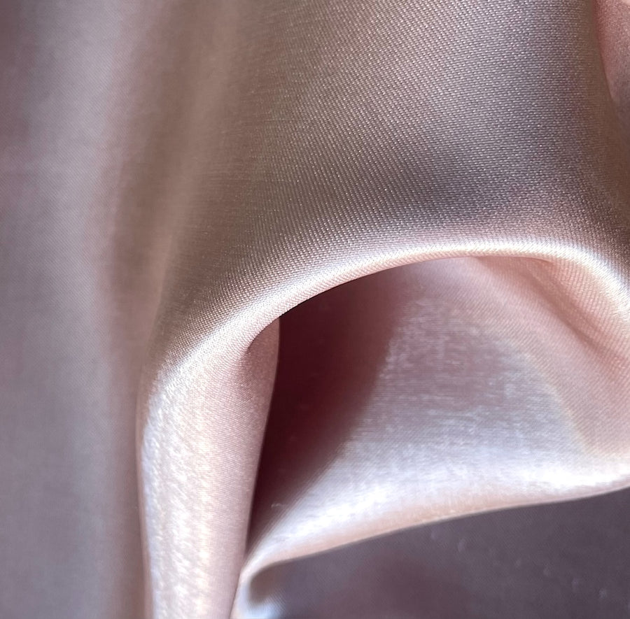 A stiffer, liquid polyester satin mikado with a twill base and in metallic Ballet Pink - a replica of silk mikado but in polyester, this shapely fabric is wonderful for fitted corsets, dramatic over-sized coats, structured ball gowns, or full skirts. Made in Korea. 100% polyester. 58" wide.