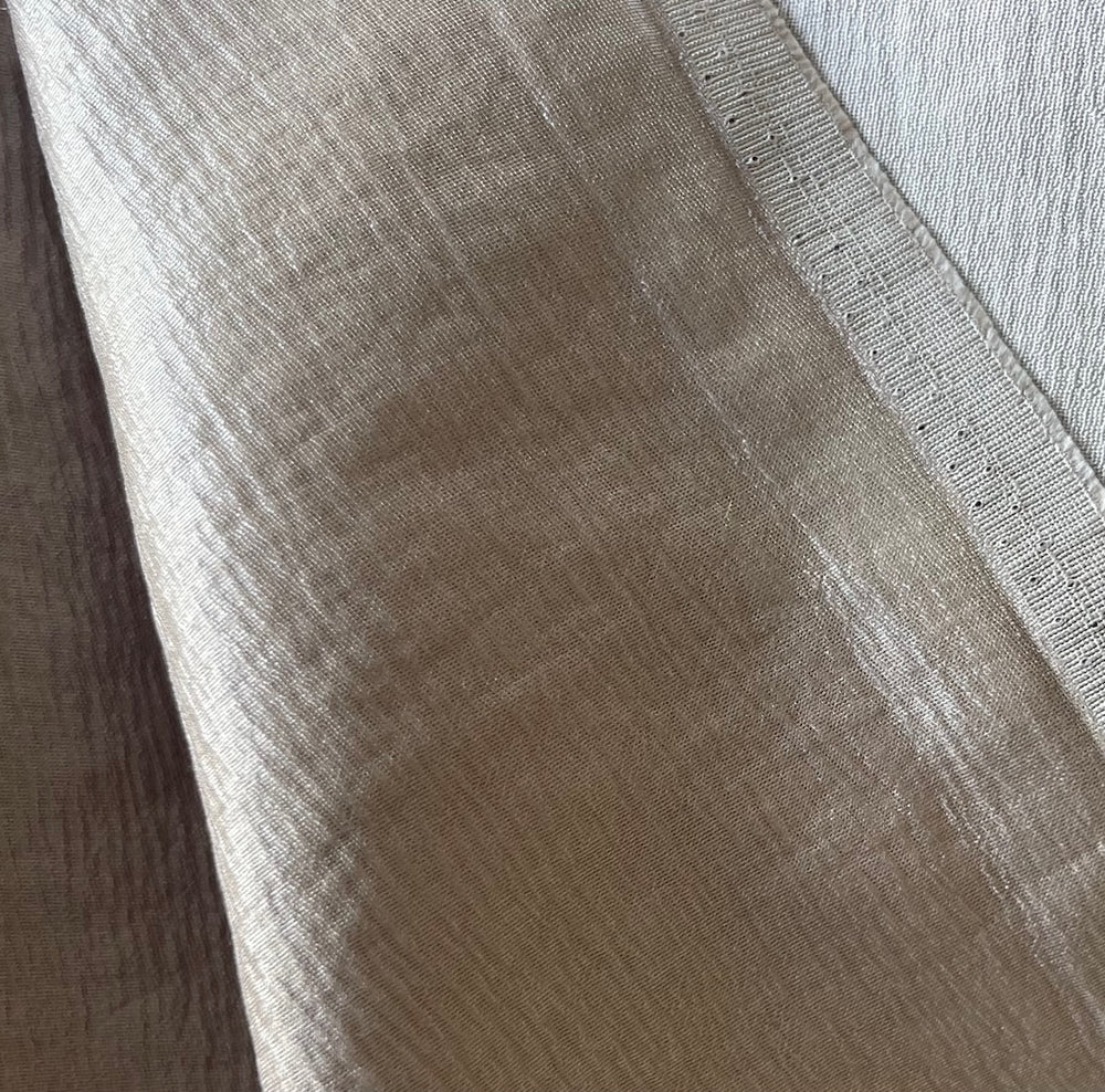 A mid-weight crinkled cotton blend double-cloth in a subtly metallic shade of flax - this drapey, shimmery cotton is perfect for loungewear, boho blouses, dresses, tunics, or flowing pants. 50% cotton and 50% polyester. 53" wide.