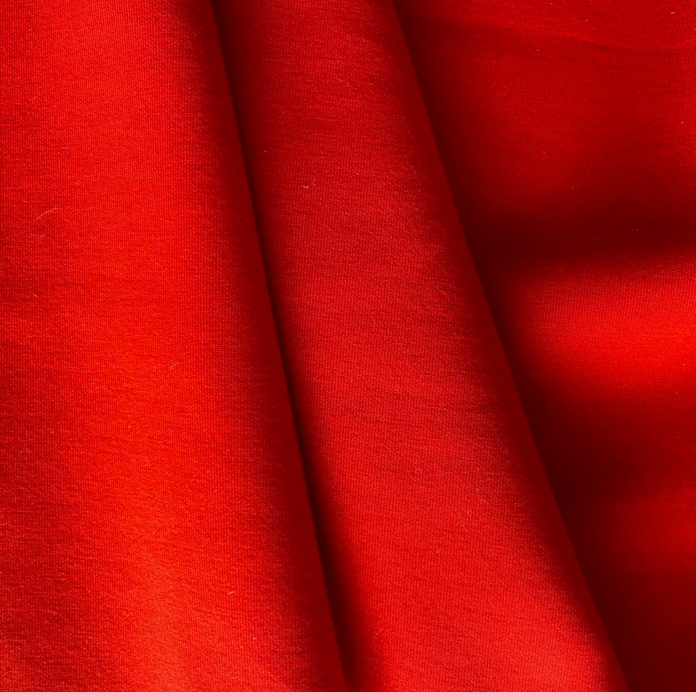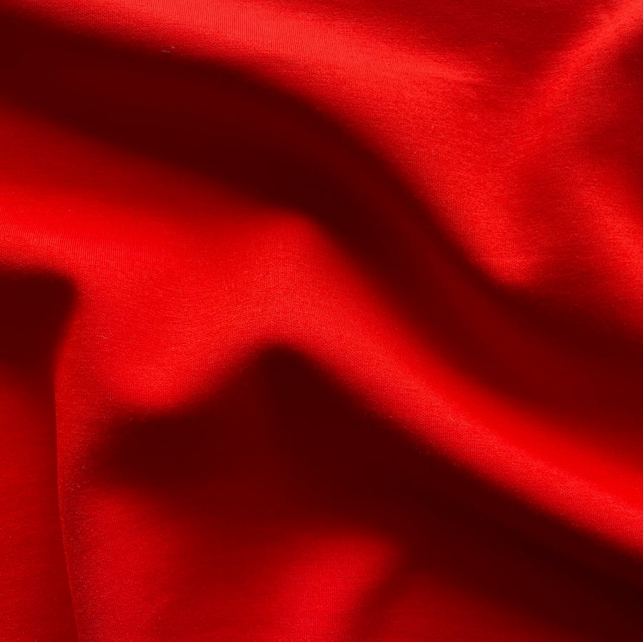 A lux mid-weight double-faced polyester blend knit in vibrant vermilion - with a touch of lycra, this soft knit is great for travel, a coat, pants, or a hoodie. Made in Italy. 71% polyester, 25% rayon, and 4% lycra. 72" extra wide.