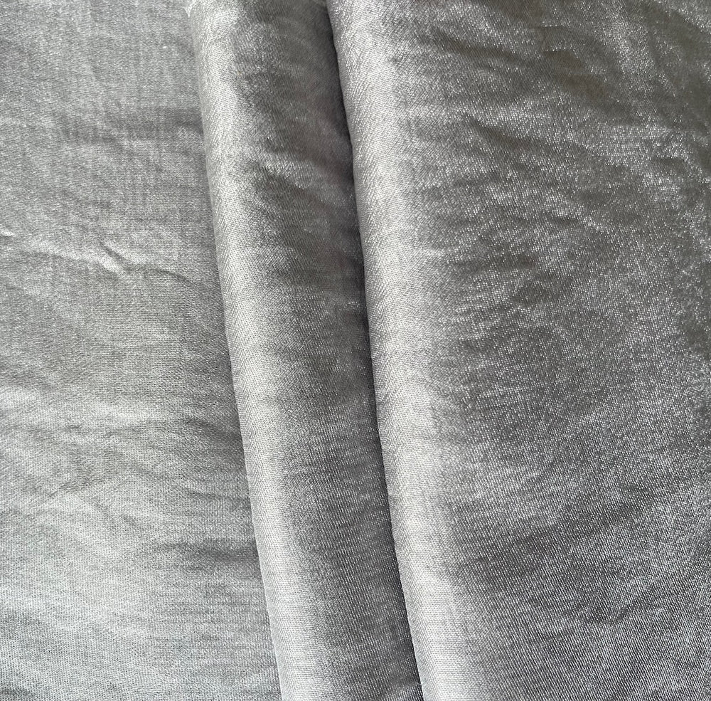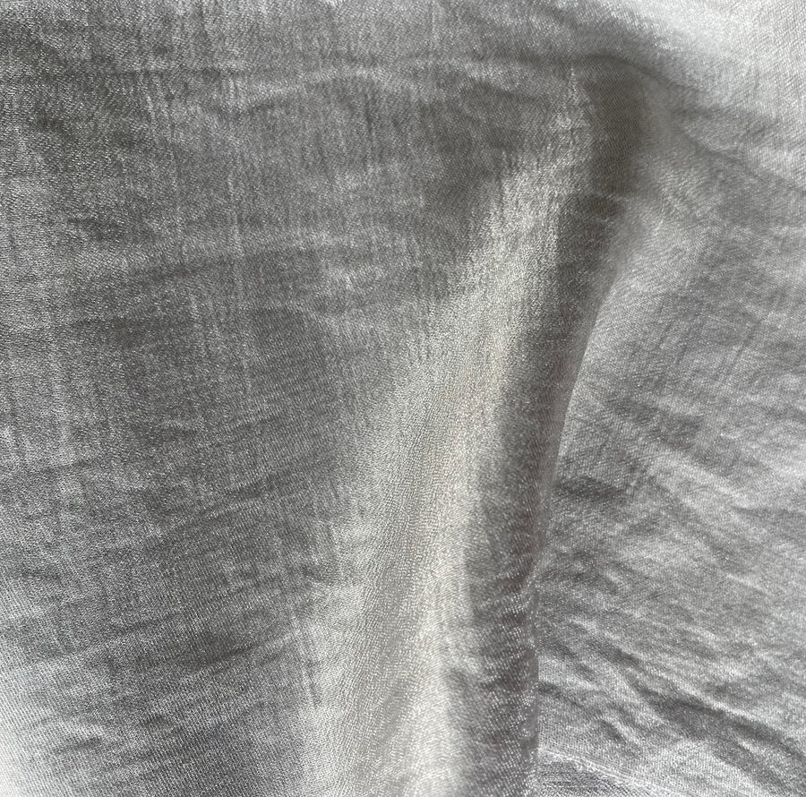 A mid-weight crinkled cotton blend double-cloth in a subtly metallic shade of Pewter Punch - this drapey, shimmery cotton is perfect for lounge-wear, boho blouses, dresses, tunics, or flowing pants. 50% cotton and 50% polyester. 54" wide.