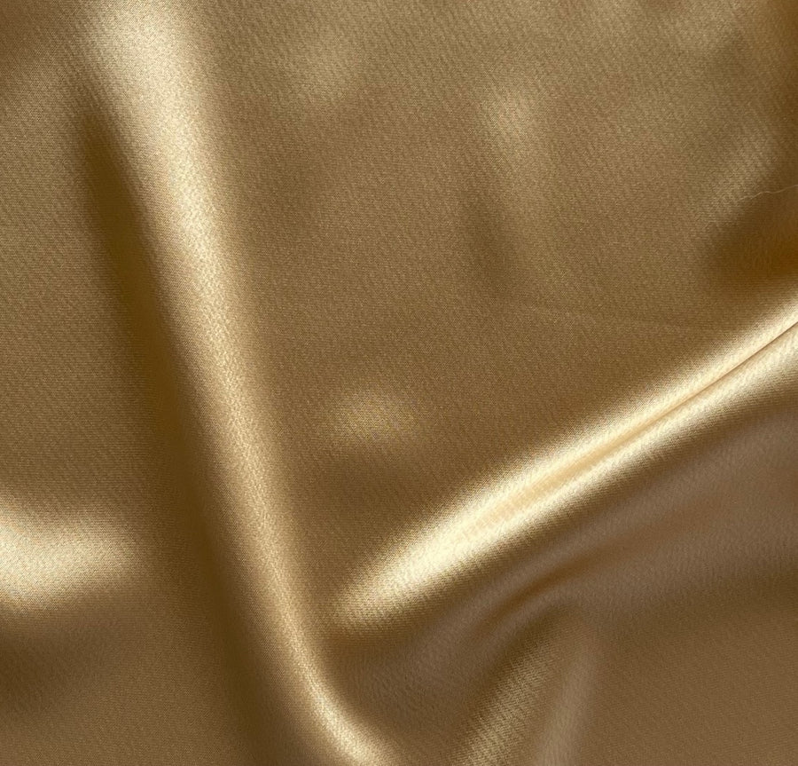 A stretch polyester satin crepe in gleaming old gold - with a hint of lycra for comfort, this fluid satin is perfect for a bias cut dress, shirts, caftans, or lounge-wear. Made in Korea. 98% polyester and 2% lycra. 54" wide.