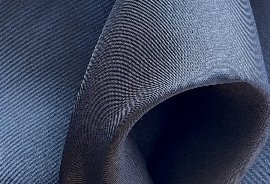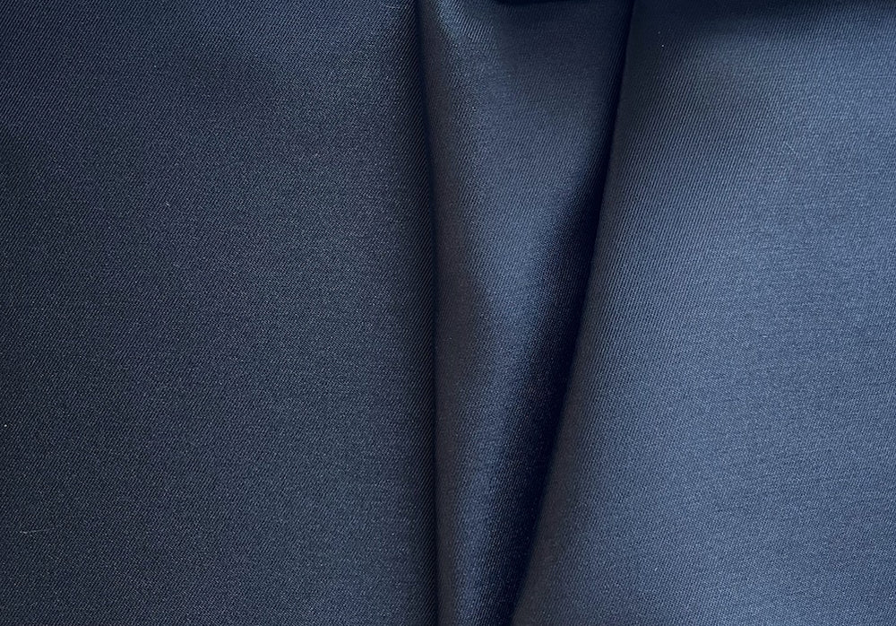 A crisp polyester mikado twill in midnight black - similar to a stiffer organza and opaque, this shapely fabric is similar in weight to silk dupioni and wonderful for fitted corsets, structured ball gowns, tablecloths, or full skirts. 100% polyester. 58" wide.
