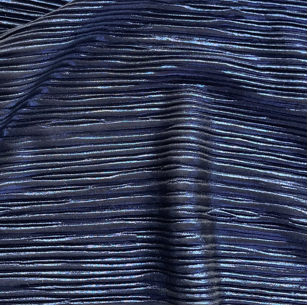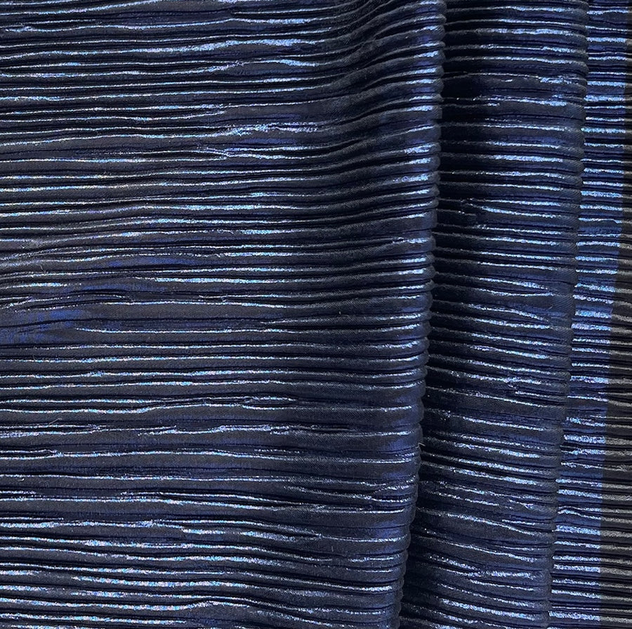 A semi-sheer, pleated stretch polyester with metallic cobalt pleats on a black base - with a hint of lycra for comfort, this lightweight fabric is perfect for skirts, tops, or a floaty dress. 90% polyester and 10% lycra. 56" wide.