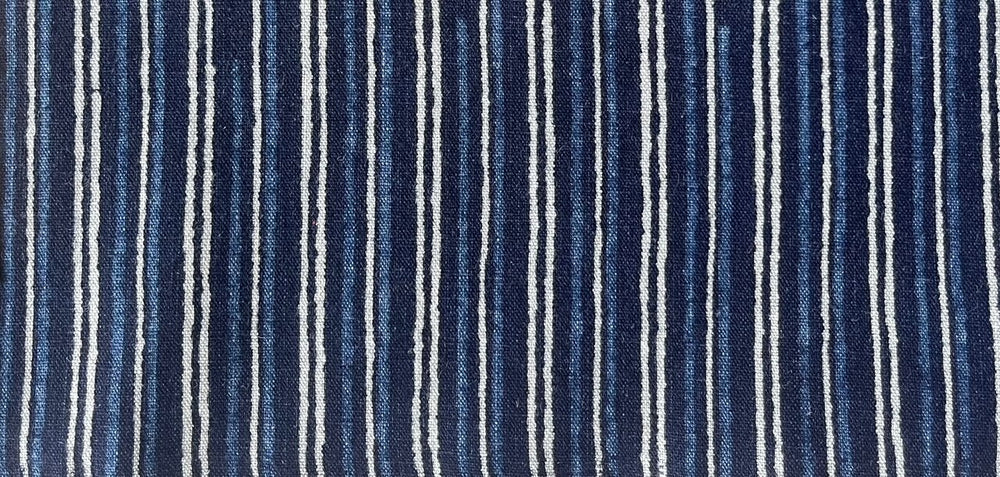 A traditional Japanese midweight indigo cotton fabric in a tone-on-tone and white Aizu stripe pattern.