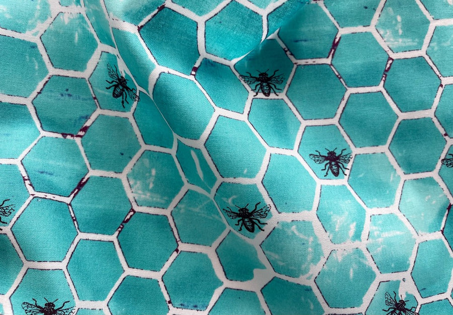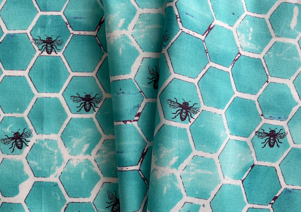A quilting cotton in a print of our favorite bee pollinators in their mottled aqua honeycomb - this honey sweet cotton is perfect for blouses, quilting, gathered skirts, and tops. Made in Japan. 100% cotton. 45" wide.