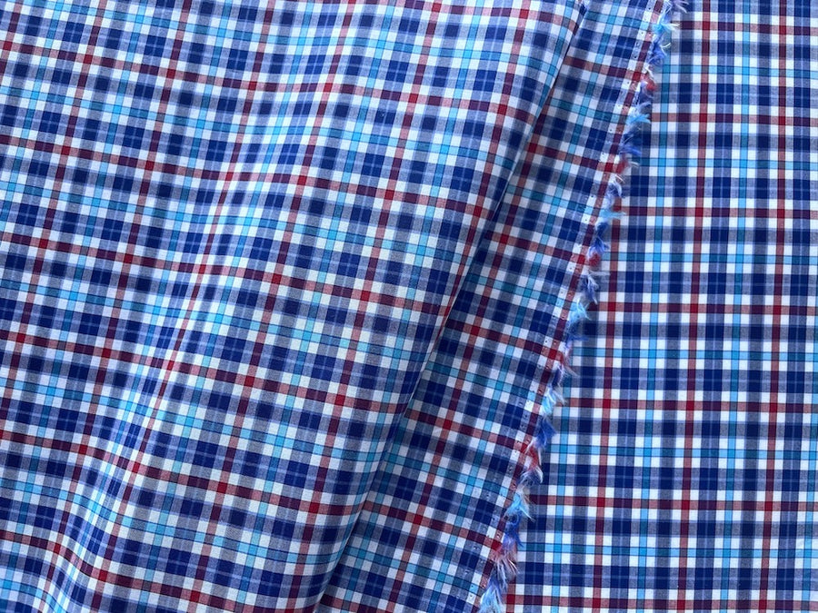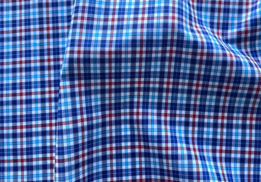 A high-end cotton poplin shirting in a charming and vibrant cherry, white, cobalt, and sky blue small-scale plaid check - with a high thread count, this tightly-woven, smooth shirting is perfect for shirts, skirts, duvet covers, or pajamas. Made in Italy. 100% cotton. 60" wide.