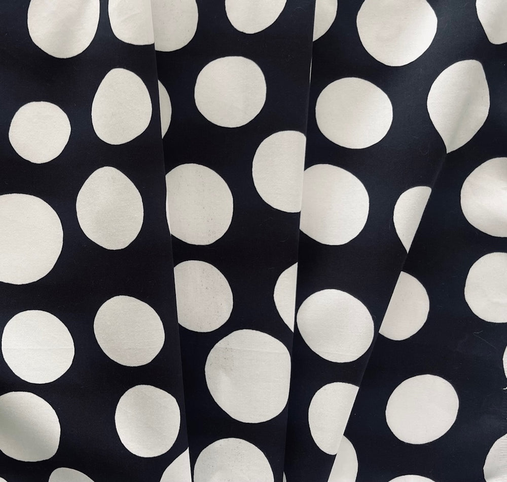 A couture cotton sateen in a print of 1 1/2" statement white dots on a jet black background - this smooth. stylish print is perfect for blouses, dresses, or a skirt. Made in Italy and used by Dolce & Gabbana. 100% cotton. 55" wide.
