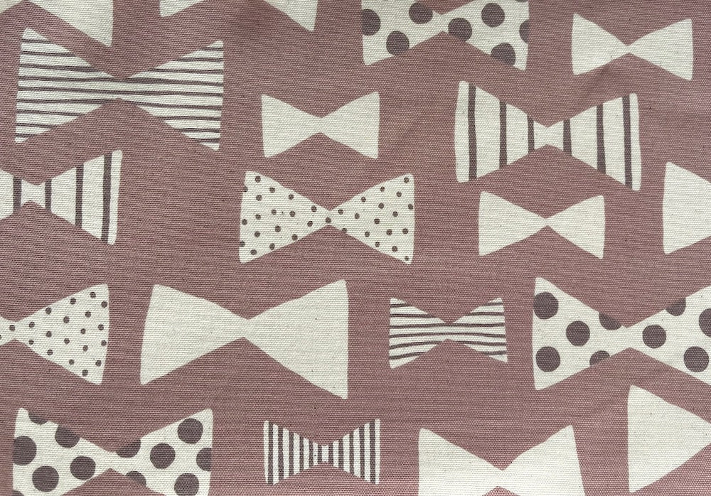 A light-weight cotton canvas adorned with dapper bow ties on a rosy Necco Wafer brown background - perfect for full skirts, blouses, totes, or summer frocks. Made in Japan. 100% cotton. 44" wide.