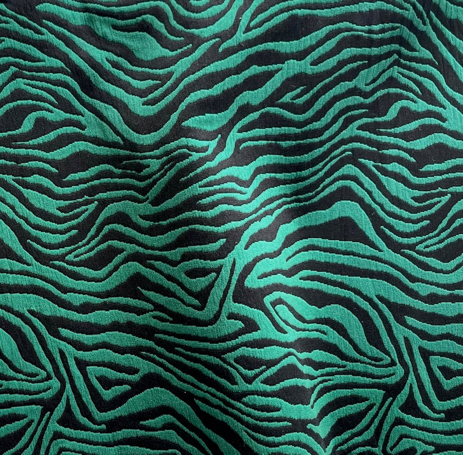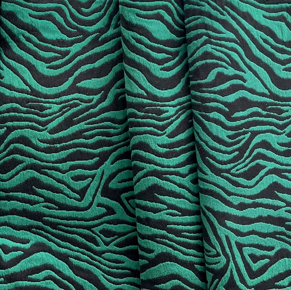 A mid-weight stretch cotton blend jacquard suiting in an emerald sea glass and black zebra design - with a hint of lycra, this stylish fabric is perfect for a chic evening coat, slim slacks, or a vintage-inspired cocktail skirt. Made in Italy. 76% cotton, 21% nylon, and 3% lycra. 42" wide.