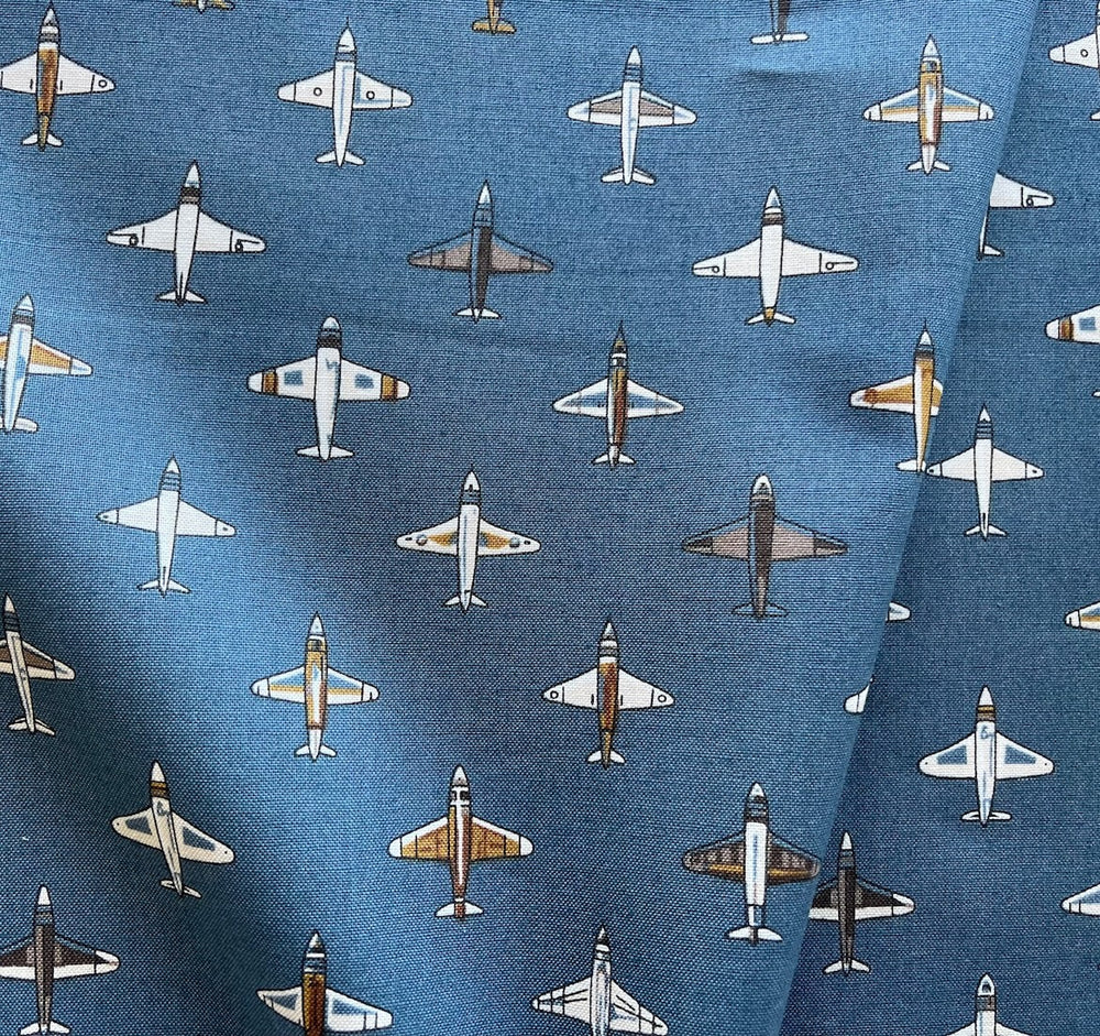 A quilting cotton in a print of rows of finely detailed airplanes on a slate blue background - this charming aviation-themed print is perfect for quilting, full skirts, blouses, totes, napkins, dish towels, or aprons. Made in Japan. 100% cotton. 45" wide.