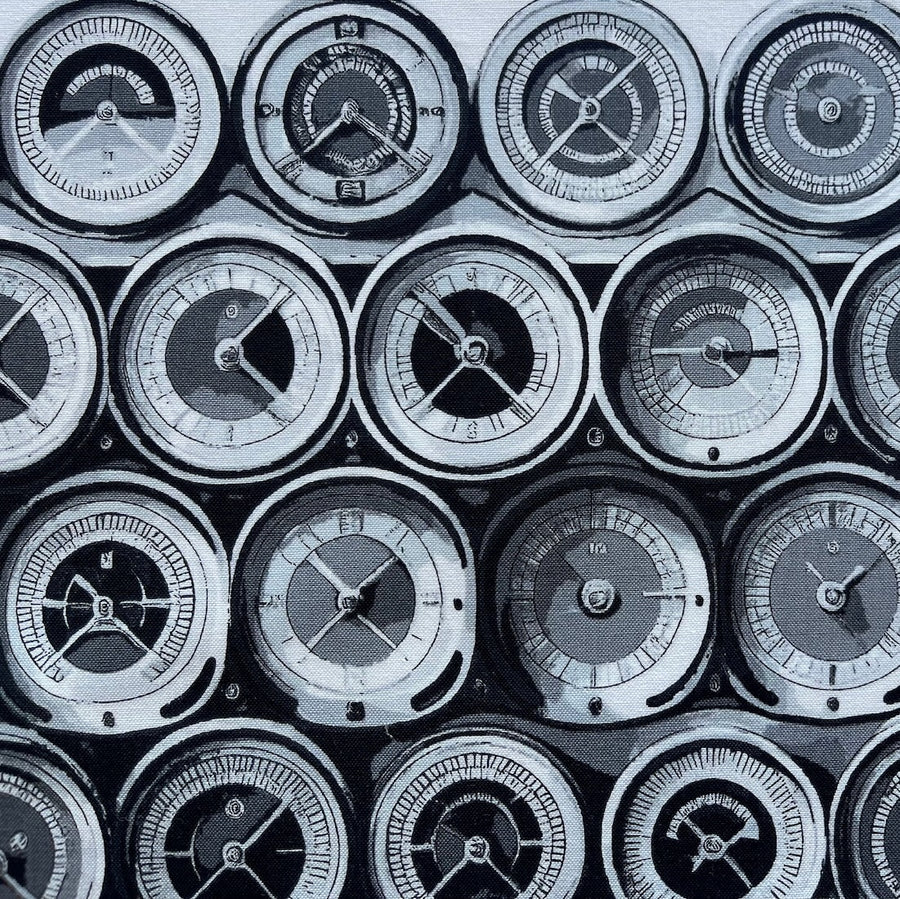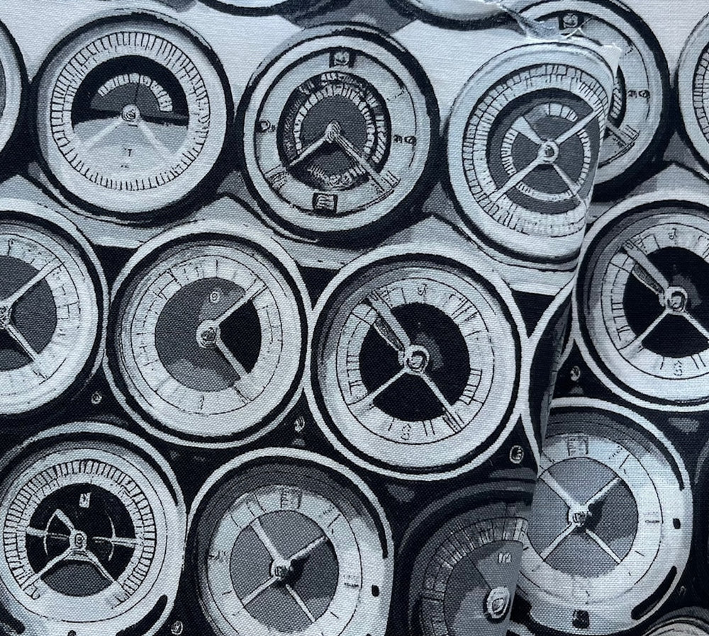 A quilting cotton in a print of rows of finely detailed airplane gauges in shades of cool greys - this charming aviation-themed print is perfect for quilting, full skirts, blouses, totes, napkins, dish towels, or aprons. Made in Japan. 100% cotton. 45" wide.