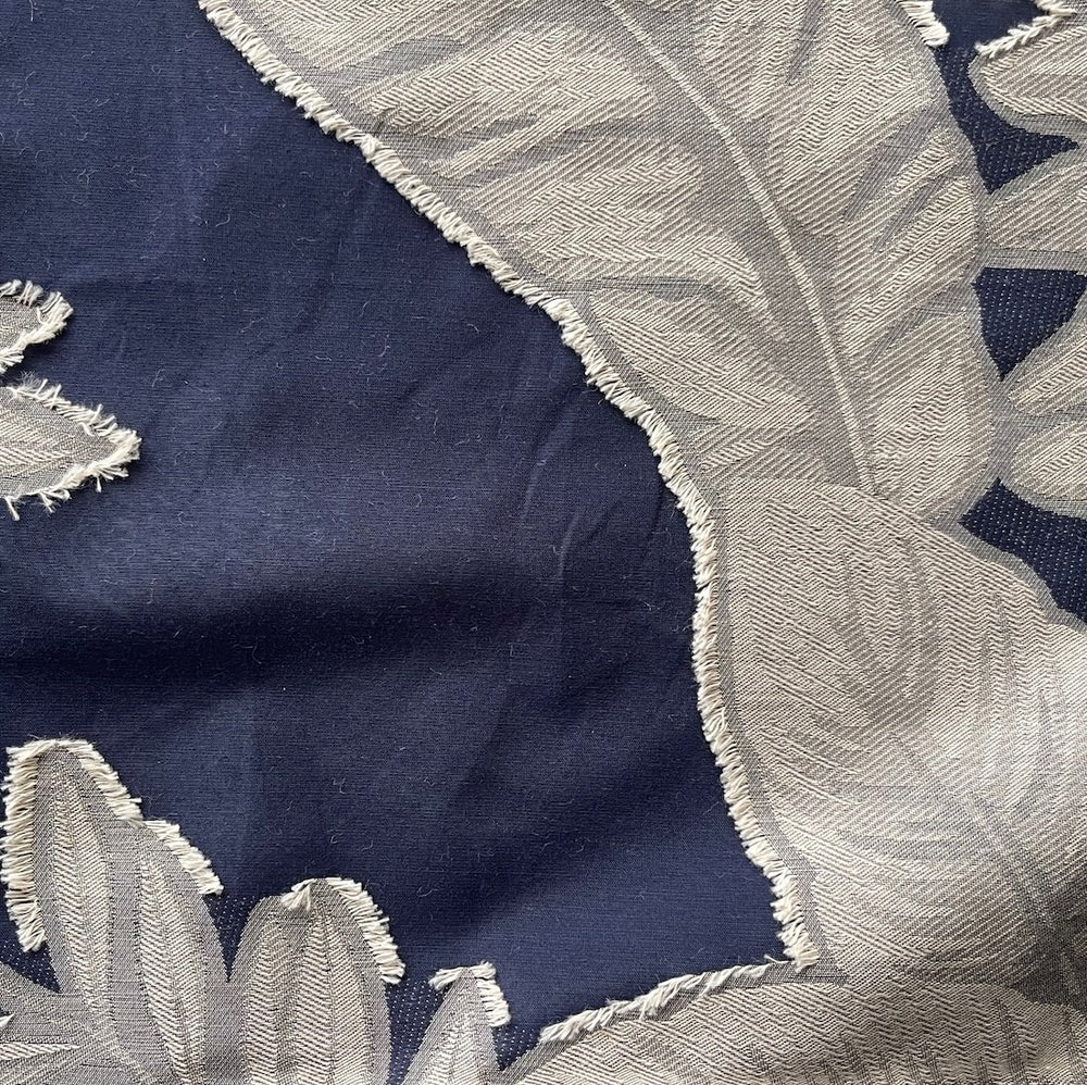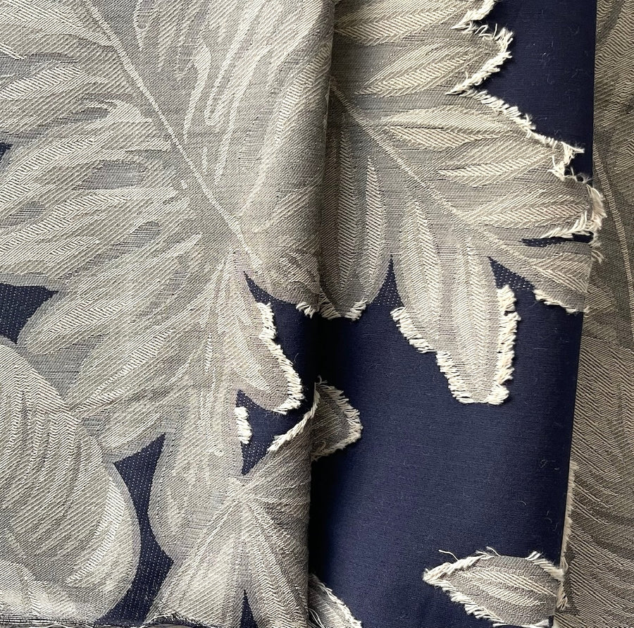 A lovely cotton blend in an print of oversized greige palm leaves on an indigo background - this cotton blend can be used on either side and would make a wonderful blouse, top, caftan, or skirt. 50% cotton and 50% polyester. 59" wide.