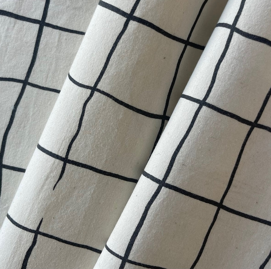 A lighter-weight cotton poplin in a hand-drawn black grid on a natural colored background - this crisp cotton poplin would make a handsome shirt, table linens, or  a blouse. Made in Japan. 100% cotton . 45" wide.