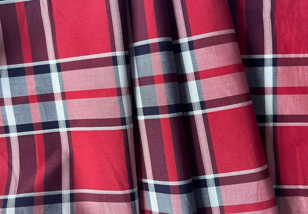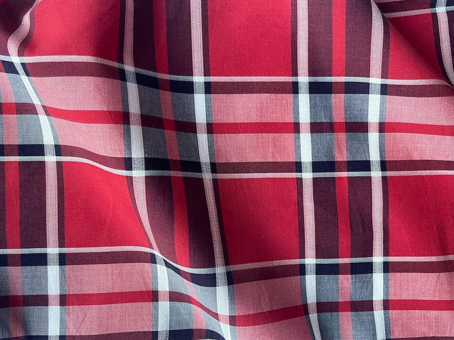 A smooth pima cotton shirting in a handsome red, black, and white plaid - with its high thread count, this tightly-woven shirting is perfect for bespoke shirts, skirts, table linens, or pajamas. Made in Italy. 100% cotton. 62" wide.