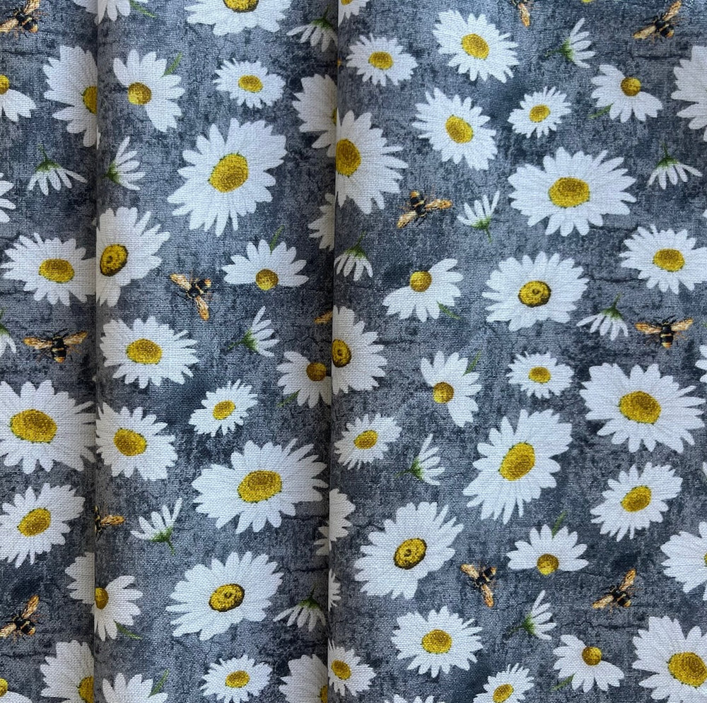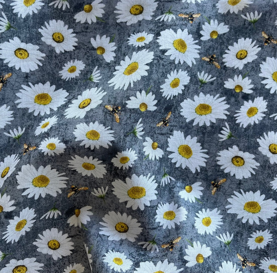 A quilting cotton of sweet daisies and bumble bees on a slate blue background - this summery print is perfect for curtains, artists, children's garments, totes, or quilting. Made in Korea. 100% cotton. 44" wide.
