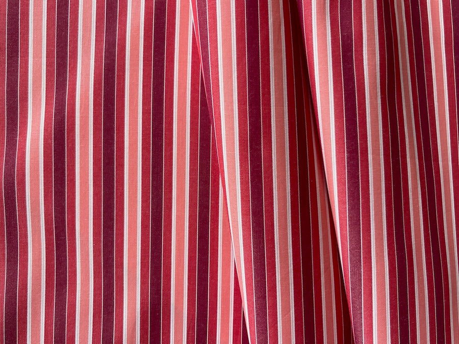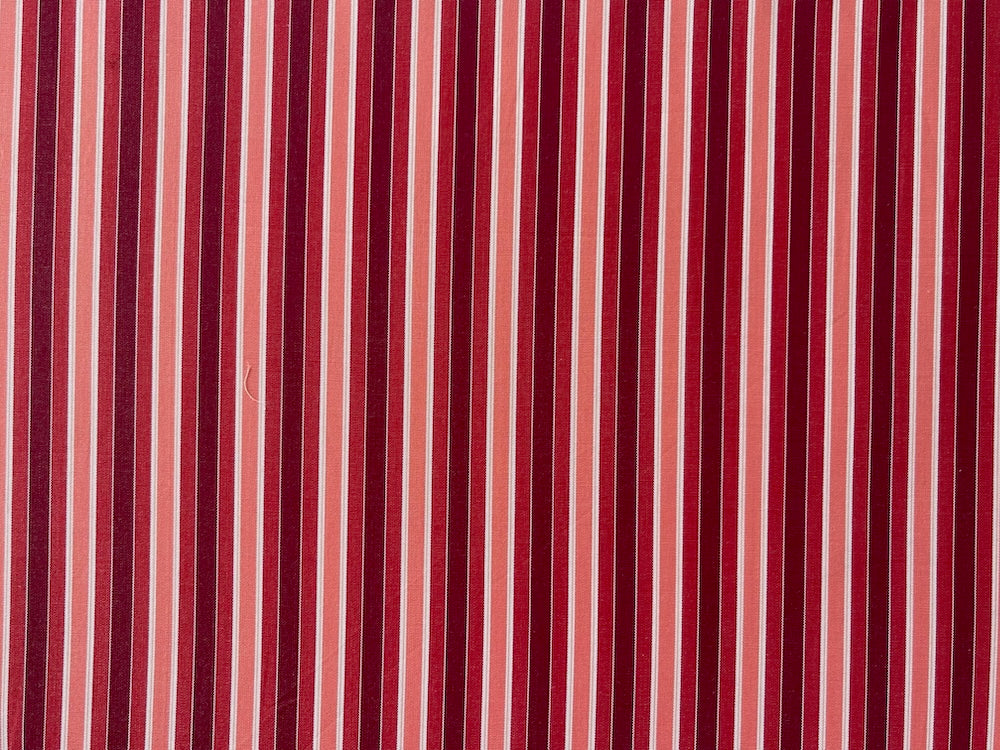 A fine 2-ply cotton shirting in garnet, peach, white, and current lengthwise stripes - smooth as butter, this airy shirting is perfect for shirts, bed linens, summer dresses, or blouses. Made in Italy by Kilton, a high-end mill. 100% cotton. 62" wide.