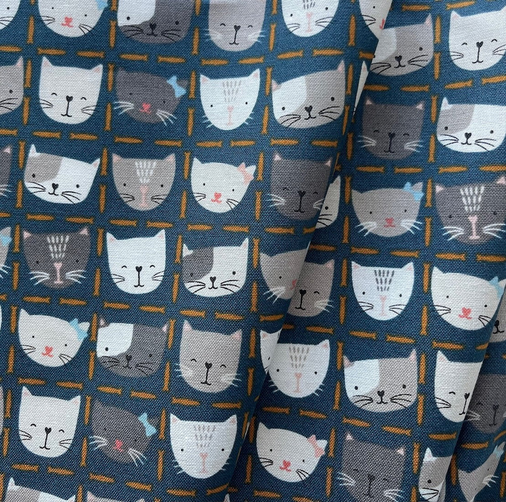 A quilting cotton in a print of handsome kitty portraits on a cadet blue and mustard background - this charming print is perfect for quilting, full skirts, blouses, totes, napkins, dish towels, or aprons. Made in Japan. 100% cotton. 45" wide.
