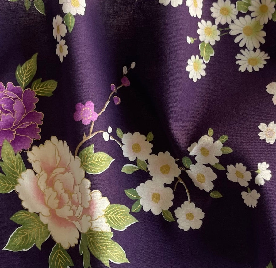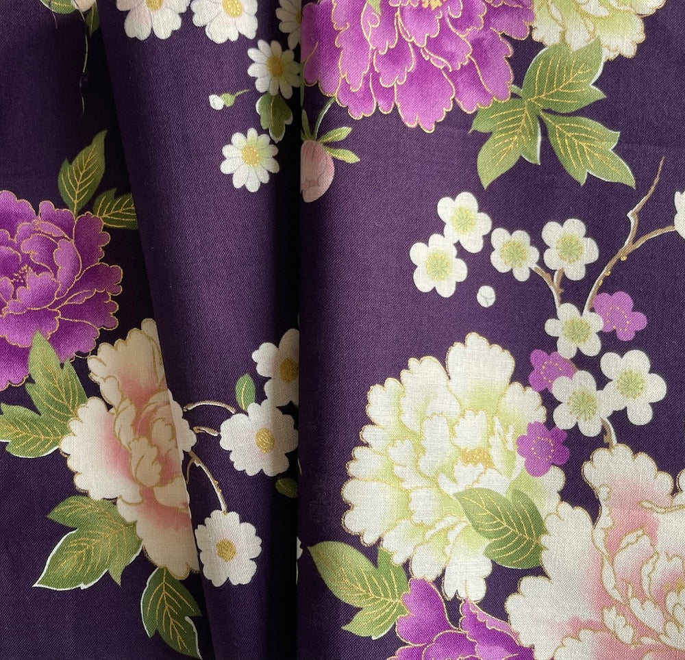 A quilting cotton in a print of camellias and cherry blossoms on a deep royal purple background and with gold metallic accents - this lush print is perfect for quilting, full skirts, blouses, totes, napkins, dish towels, or aprons. Made in Japan by Kokka. 100% cotton. 44" wide.