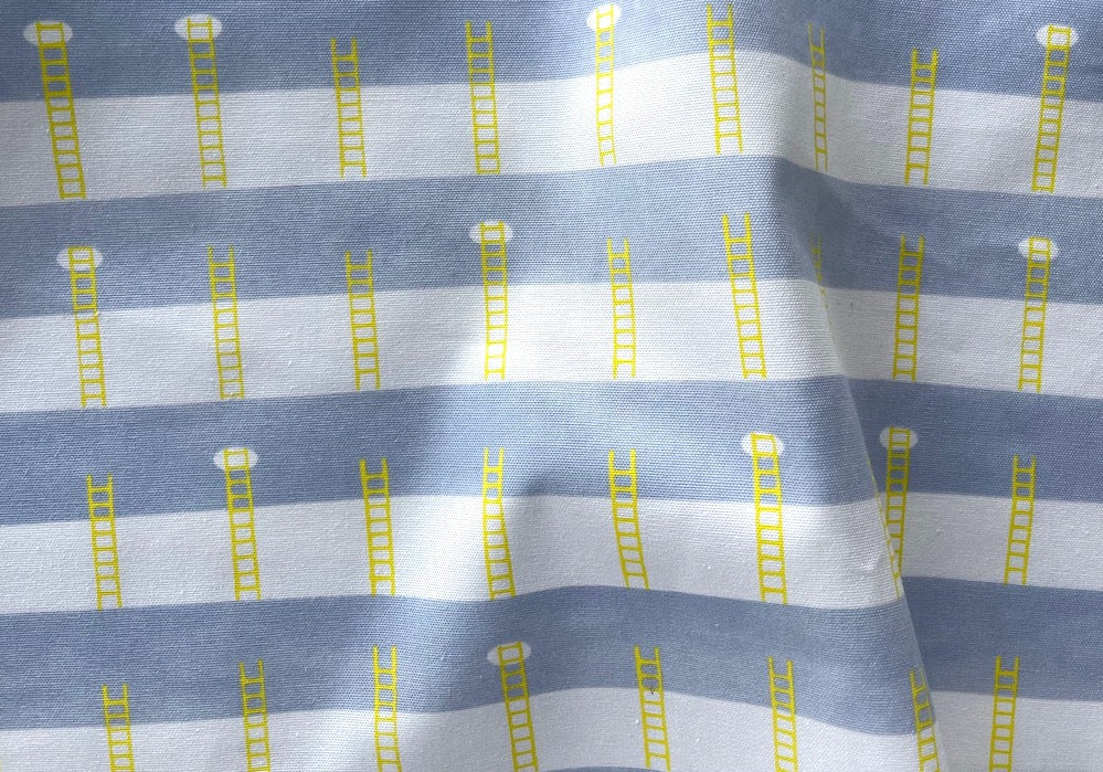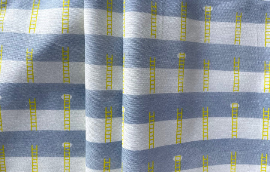 A light-weight cotton canvas with lemon yellow ladders against a background of 1" wide sky blue and white crosswise stripes - this sweet print is perfect for a full skirt, curtains, totes, or table linens. Made in Japan. 100% cotton. 45" wide.