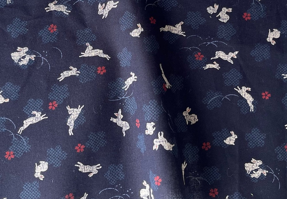 A quilting cotton with lucky white bunnies hopping on an indigo background - perfect for full skirts, blouses, table linens, or summer frocks. Made in Japan. 100% cotton. 44" wide.