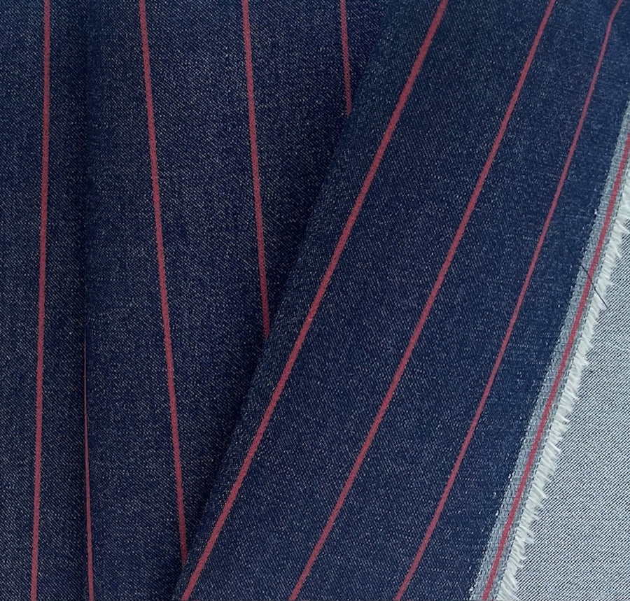 A mid-weight stretch cotton denim twill in a lengthwise apple red stripe on true blue navy - with a hint of lycra, this structured cotton denim is perfect for a jumpsuit, a trucker jacket, or a pant. Made in Italy. 93% cotton and 7% lycra. 51" wide.