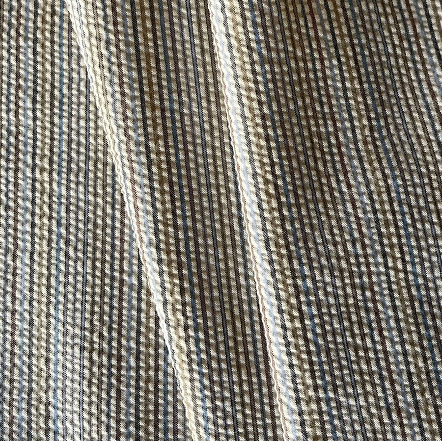 A mid-weight cotton blend seersucker in discrete pecan, beige, and sky blue lengthwise stripes - this handsome seersucker cotton is perfect for golfing attire a vintage style shirtwaist dress, a guayaberra style shirt, or a jacket. Made in Italy. 50% cotton and 50% polyester. 60" wide.