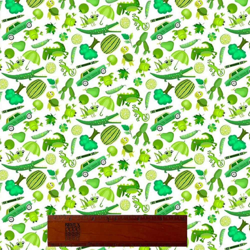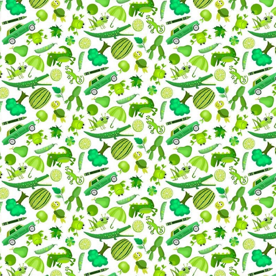 A quilting cotton of mini grass green scattered creatures and objects on a white background. How many creatures and objects can you spy? We see grasshoppers and pears! This charming print is perfect for curtains, children's garments, a teaching place mat, or quilting. 100% cotton. 44" wide.