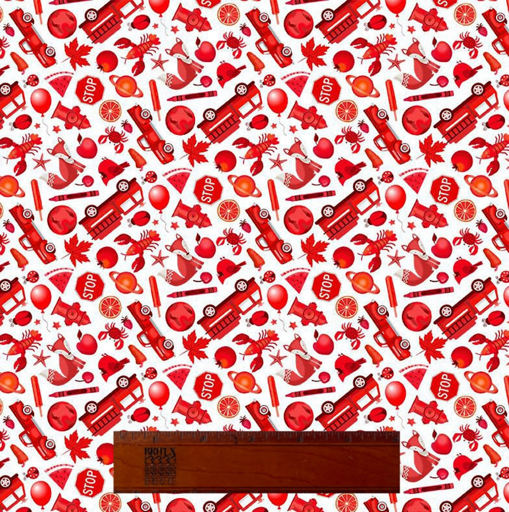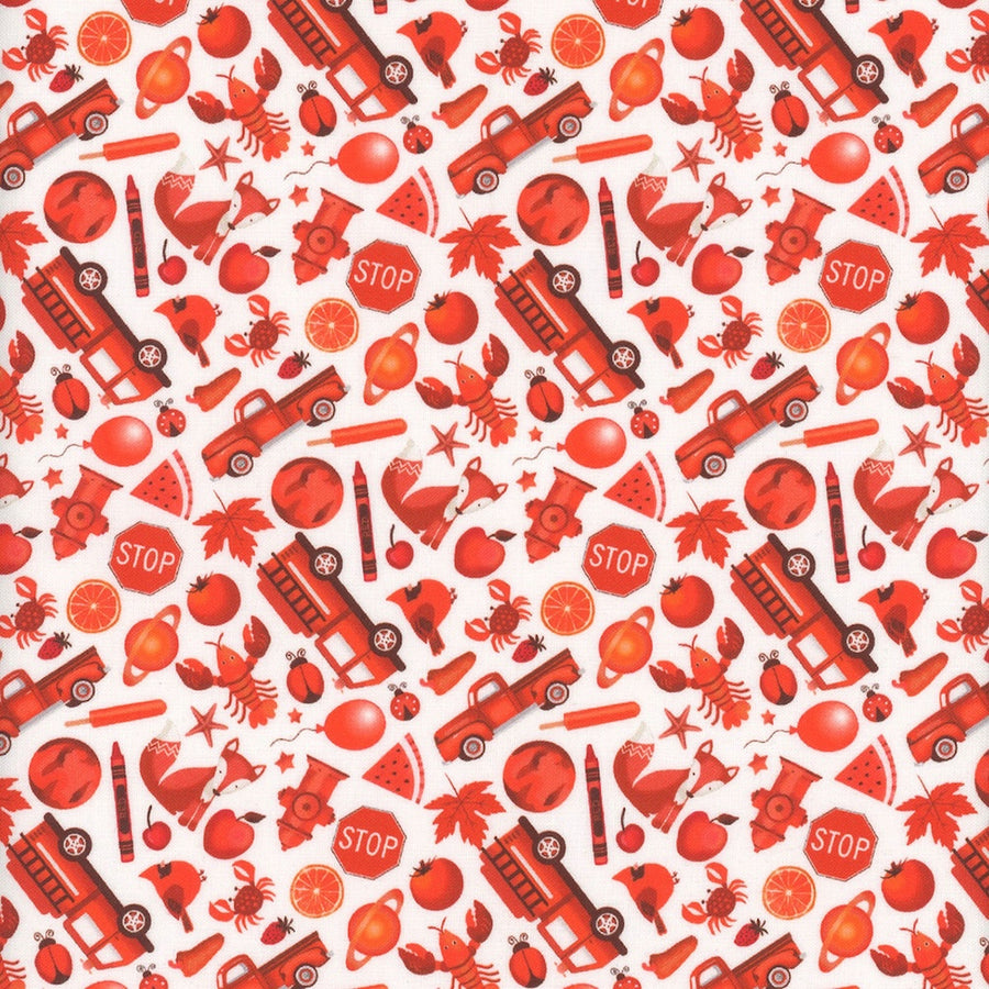 A quilting cotton of mini red scattered creatures and objects on a white background. How many creatures and objects can you spy? We see tomatoes and lobsters! This charming print is perfect for curtains, children's garments, a teaching place mat, or quilting. 100% cotton. 44" wide.