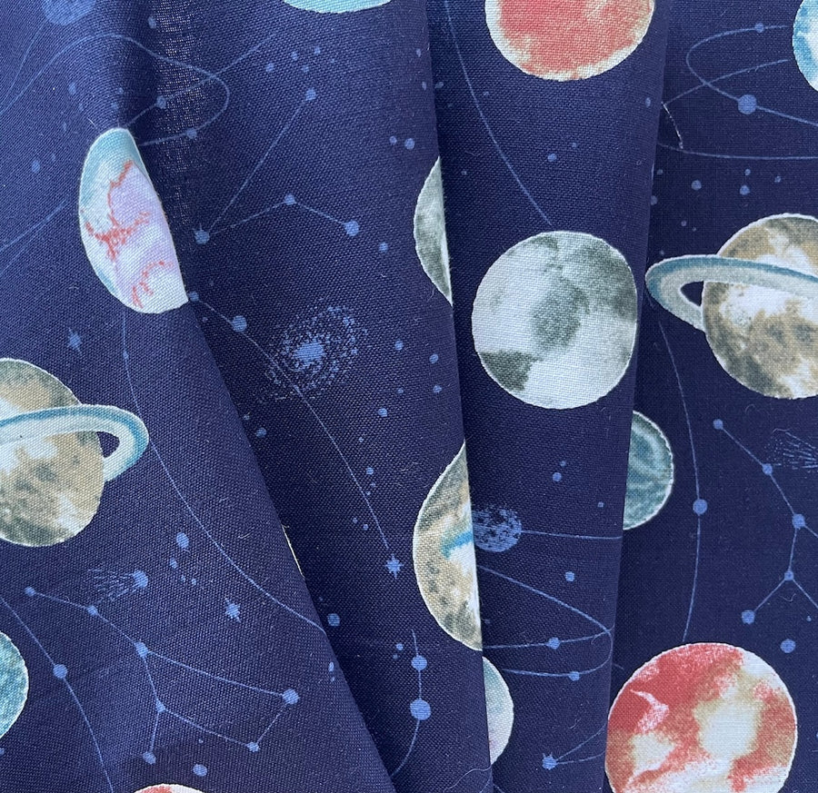 A quilting cotton in a celestial print of plants and constellations on a navy background - this scientific print is perfect for gift wrapping, full skirts, blouses, totes, napkins, or aprons. Made in Japan. 100% cotton. 45" wide.