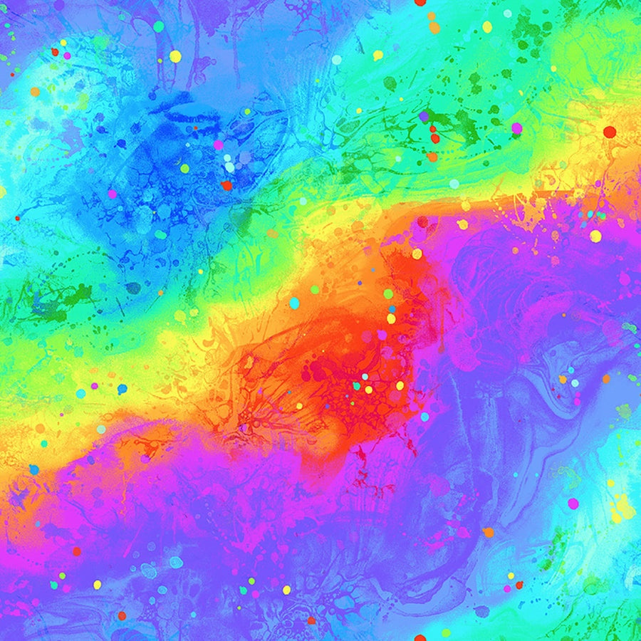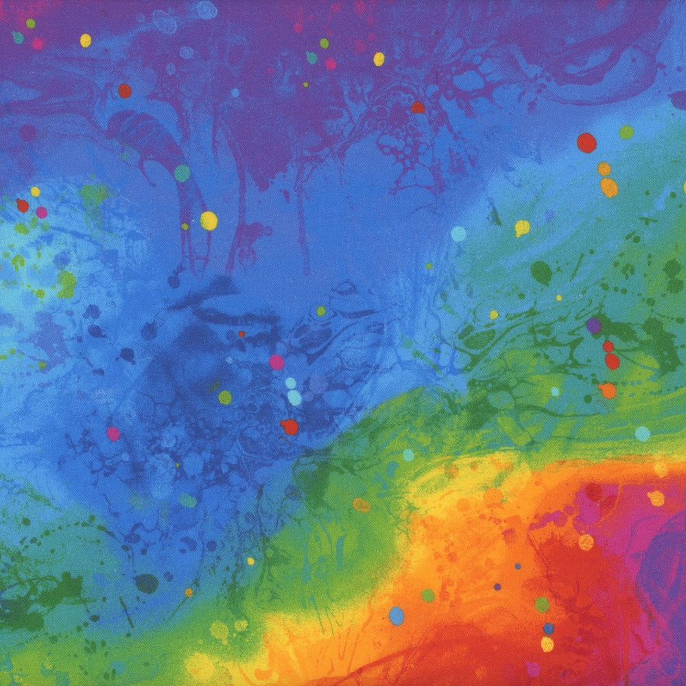 A quilting cotton of splatters on top of painterly diagonal rainbow bands - this vibrant print is perfect for curtains, children's garments, totes, or quilting. 100% cotton. 44" wide.