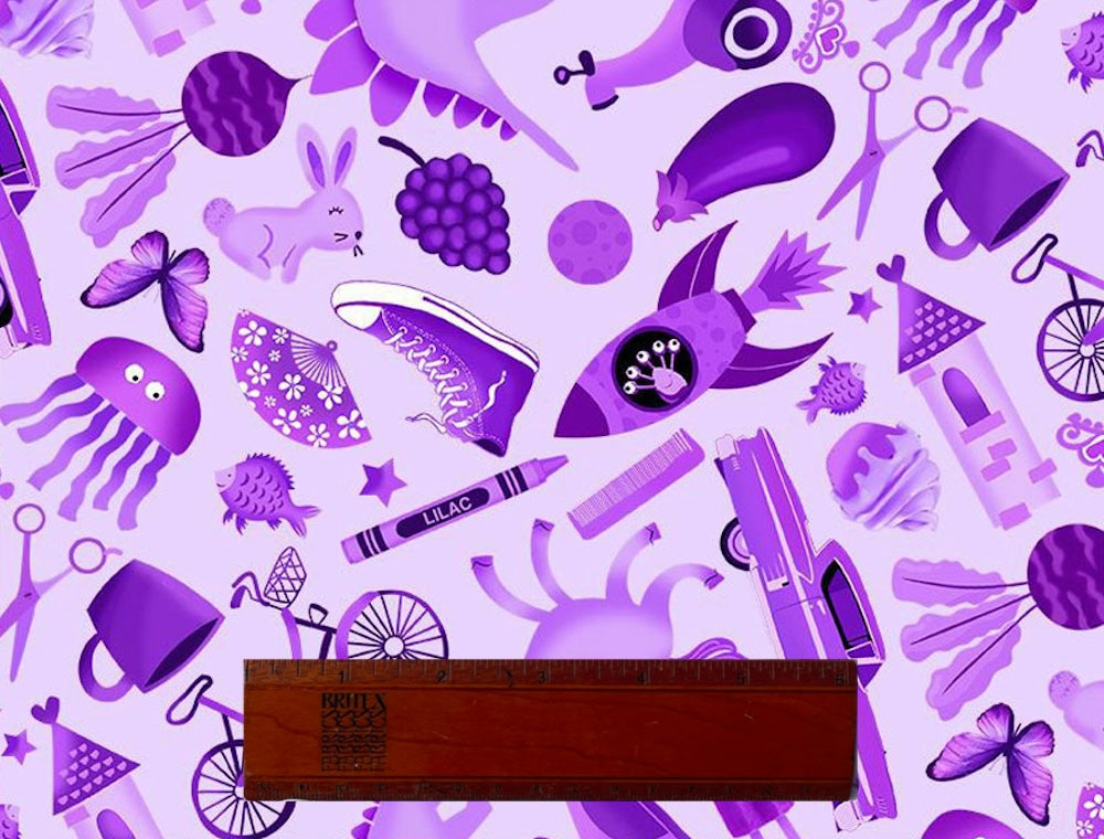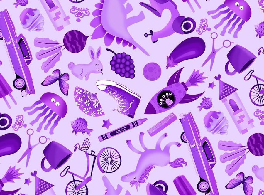 A quilting cotton of grape purple scattered creatures and objects on a pale purple background. How many creatures and objects can you spy? We see rockets and eggplants! This charming print is perfect for curtains, children's garments, a teaching place mat, or quilting. 100% cotton. 44" wide.