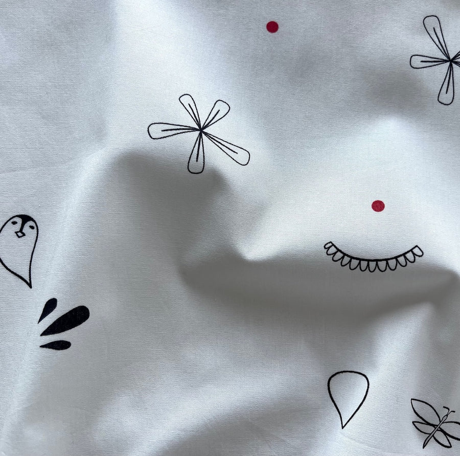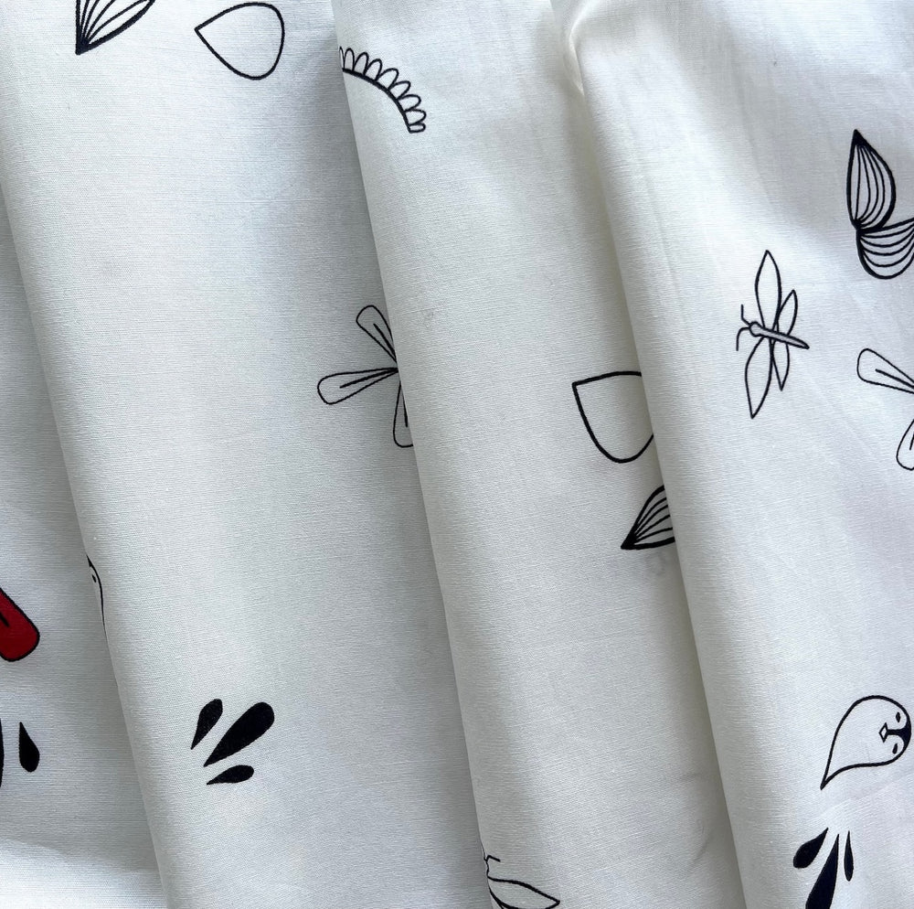An airy cotton lawn in a print of widely spaced random treasures and red polka dots on a white background - this understated comical print is perfect for blouses, sundresses, and shirts. Made in Italy. 100% cotton. 59" wide.