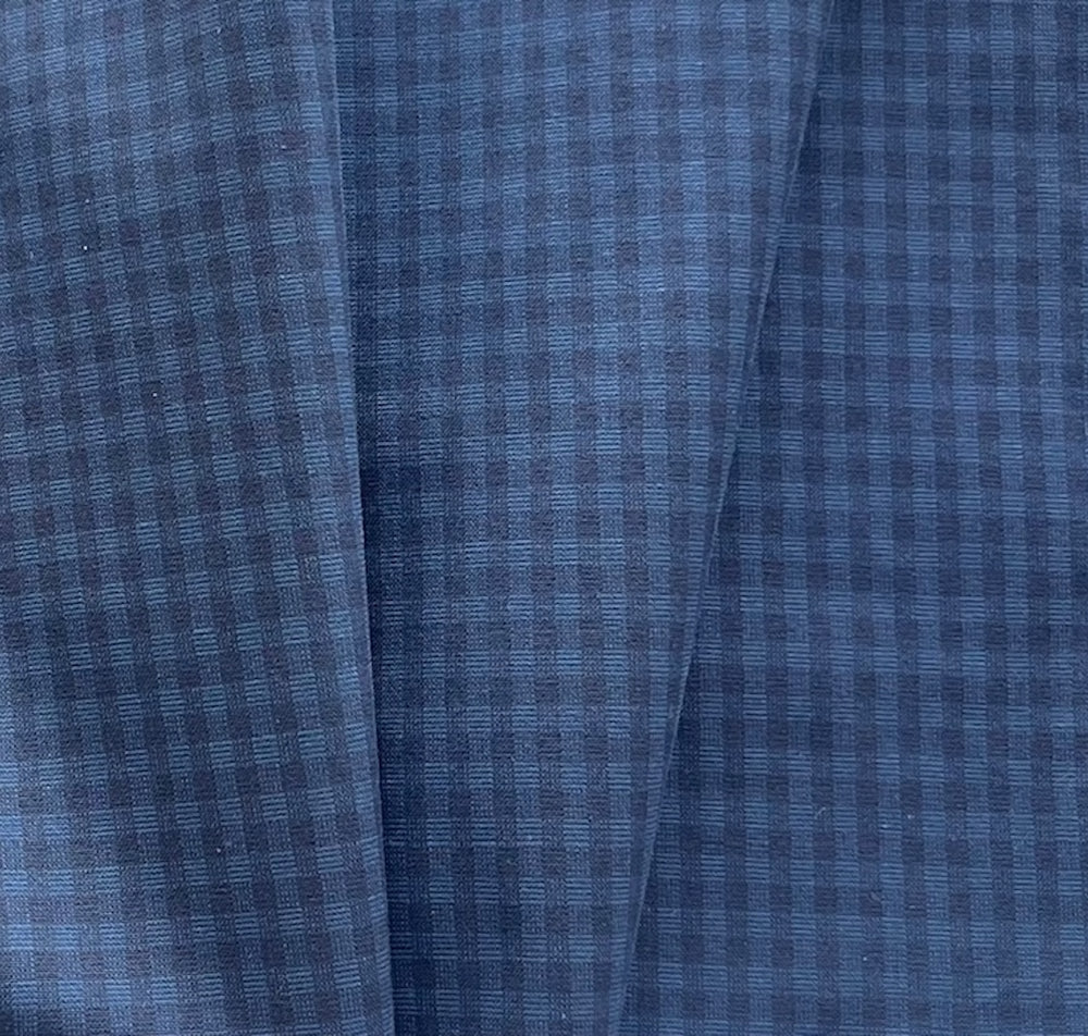A mid-weight cotton suiting in a washed denim blue and navy blue check - this smooth, tightly woven, stylish cotton suiting is perfect for a chic suit, slim slacks, or a vintage-inspired cocktail skirt. Made in Italy. 100% cotton. 62" wide.