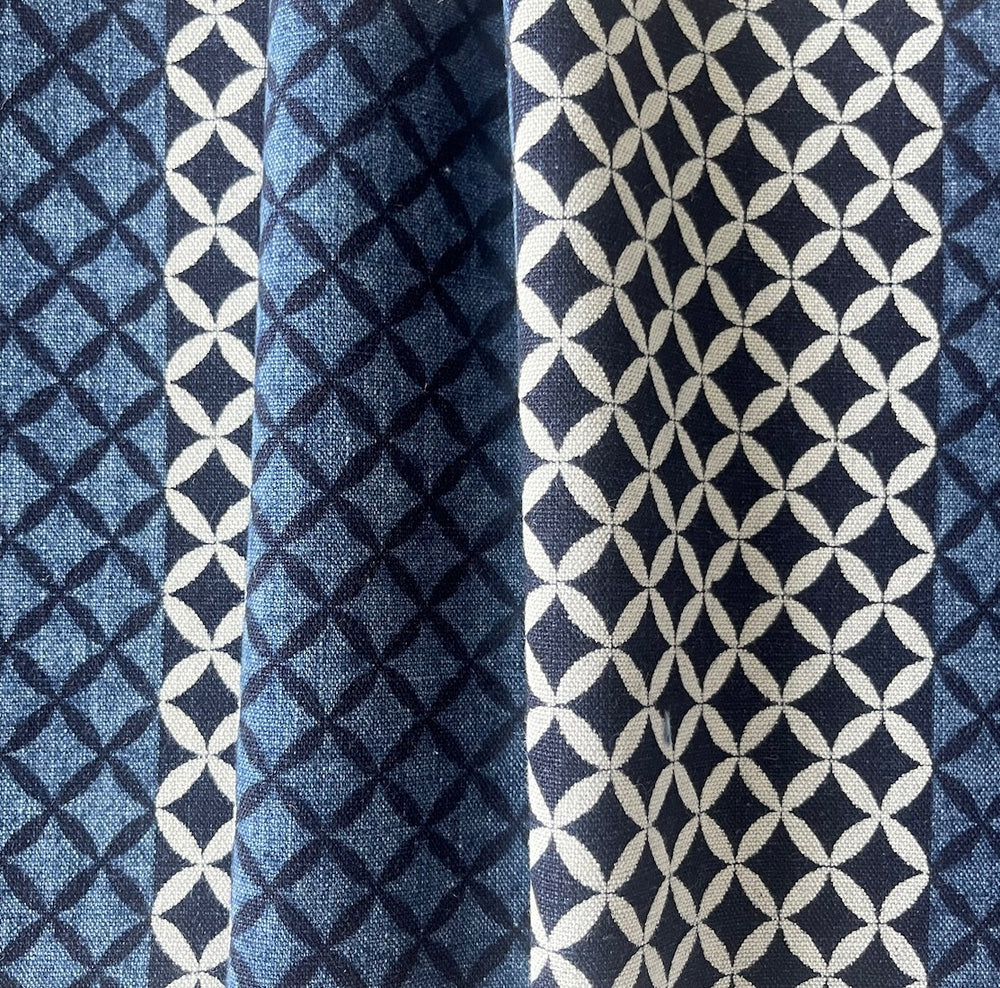 Indigo fabrics wash and dry beautifully; they are naturally antibacterial and dirt-repelling, and the dye ages like leather instead of fading. These beautiful fabrics are made from Japanese cotton, and they're dyed and printed in Japan.