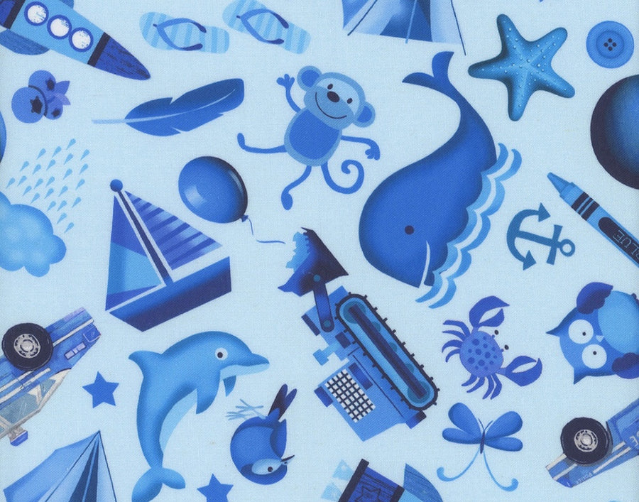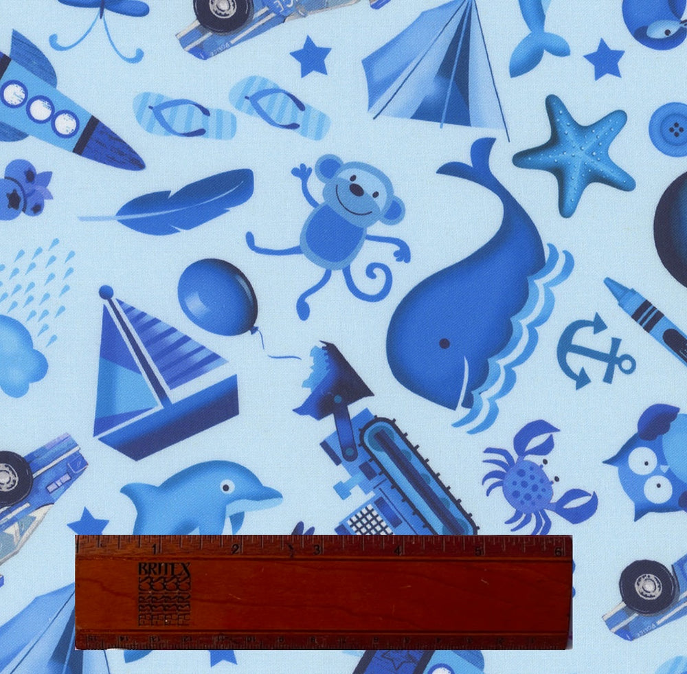 A quilting cotton of ultramarine blue scattered creatures and objects on a light blue background. How many creatures and objects can you spy? We see crabs and feathers! This charming print is perfect for curtains, children's garments, a teaching place mat, or quilting. 100% cotton. 44" wide.